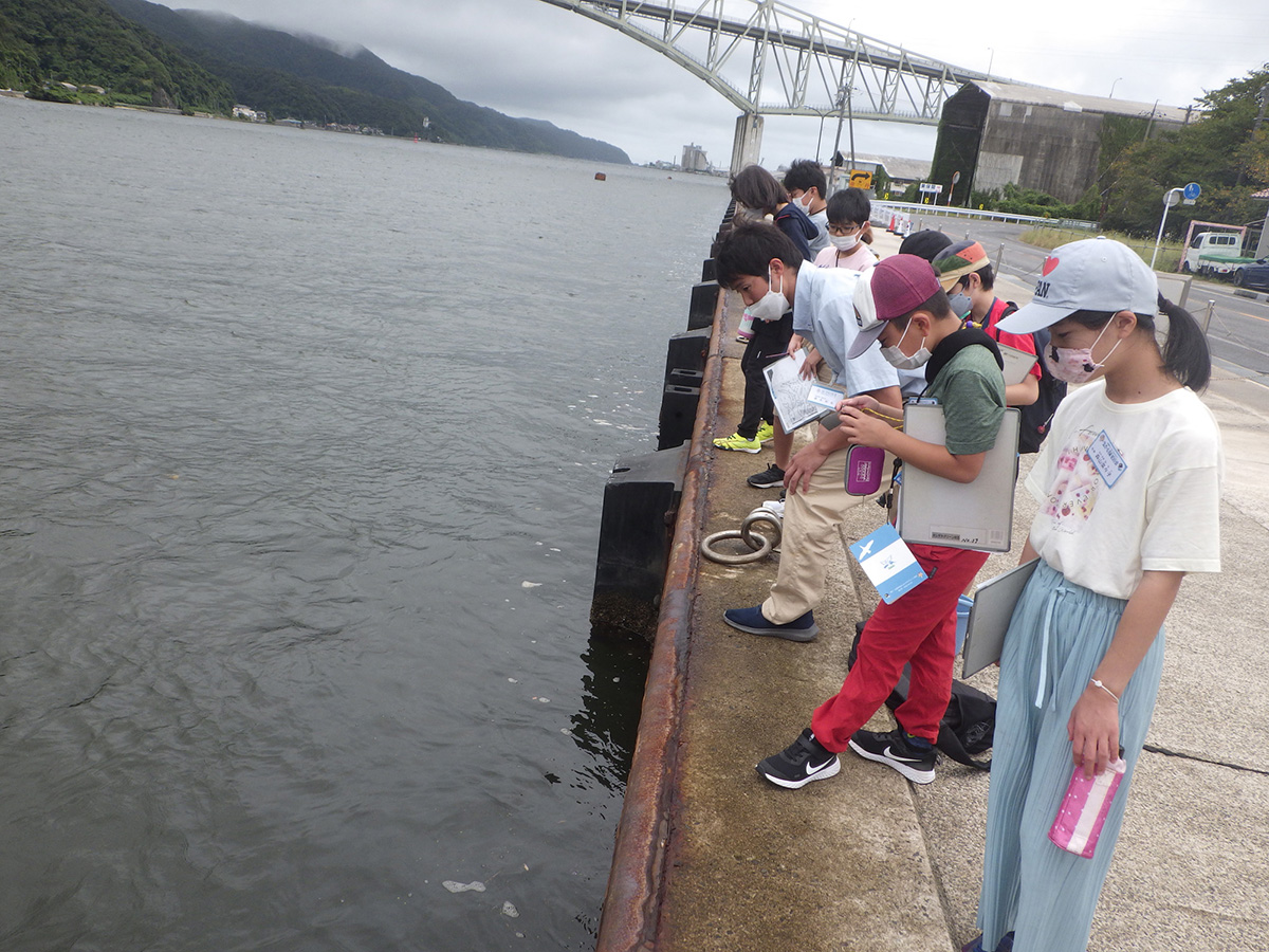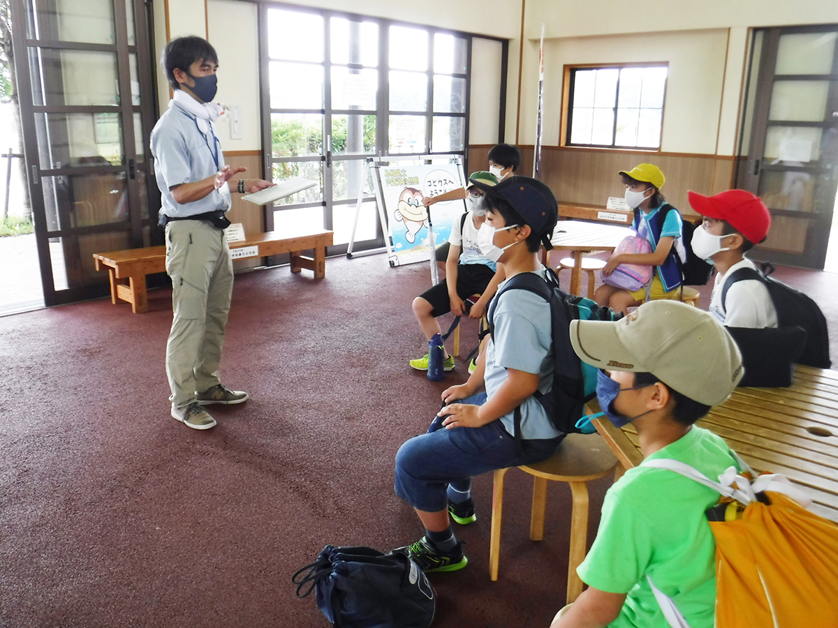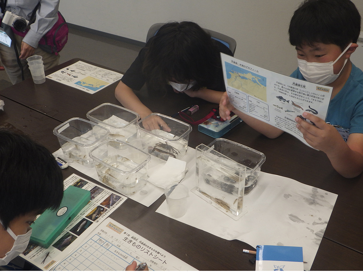 令和4年度ラムサール探偵団が始まりました。小学4年生から中学1年生までの計9名が団員として集まりました。第1回目は、結団式から始まりました。依頼状に書かれた今年度の団員へのお題は、「宍道湖、斐伊川、中海がわたしたちにもたらしてくれる自然のめぐみを見つけて教えてください。」です。斐伊川の源流付近、中海へとつながる境水道へも出かける予定です。各地で、団員それぞれの思う自然のめぐみを見つけてくれることを楽しみにしています。結団式のあとは、宍道湖を含む斐伊川水系やラムサール条約について話を聞きながら、ゴビウスを見学しました。午後は、実際に宍道湖に入り、宍道湖にすむ生きものを採集しました。どんな生きものが採れたのかを調べ、特徴をスケッチし、その特徴や生きものについて思ったことを発表しました。