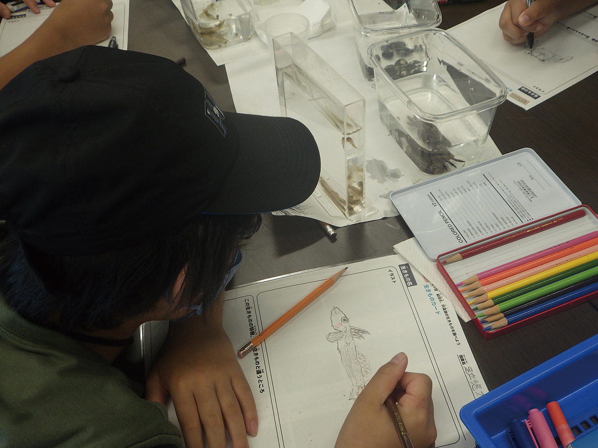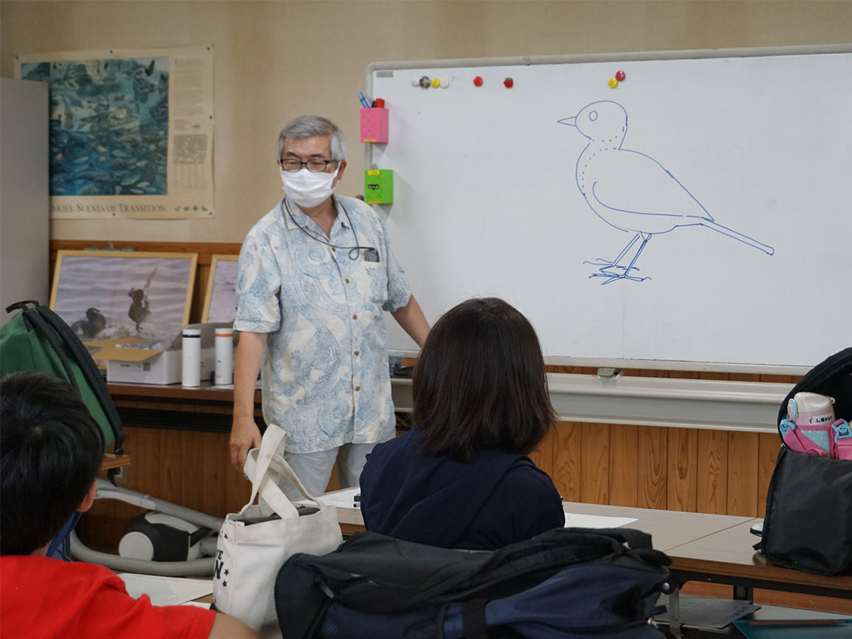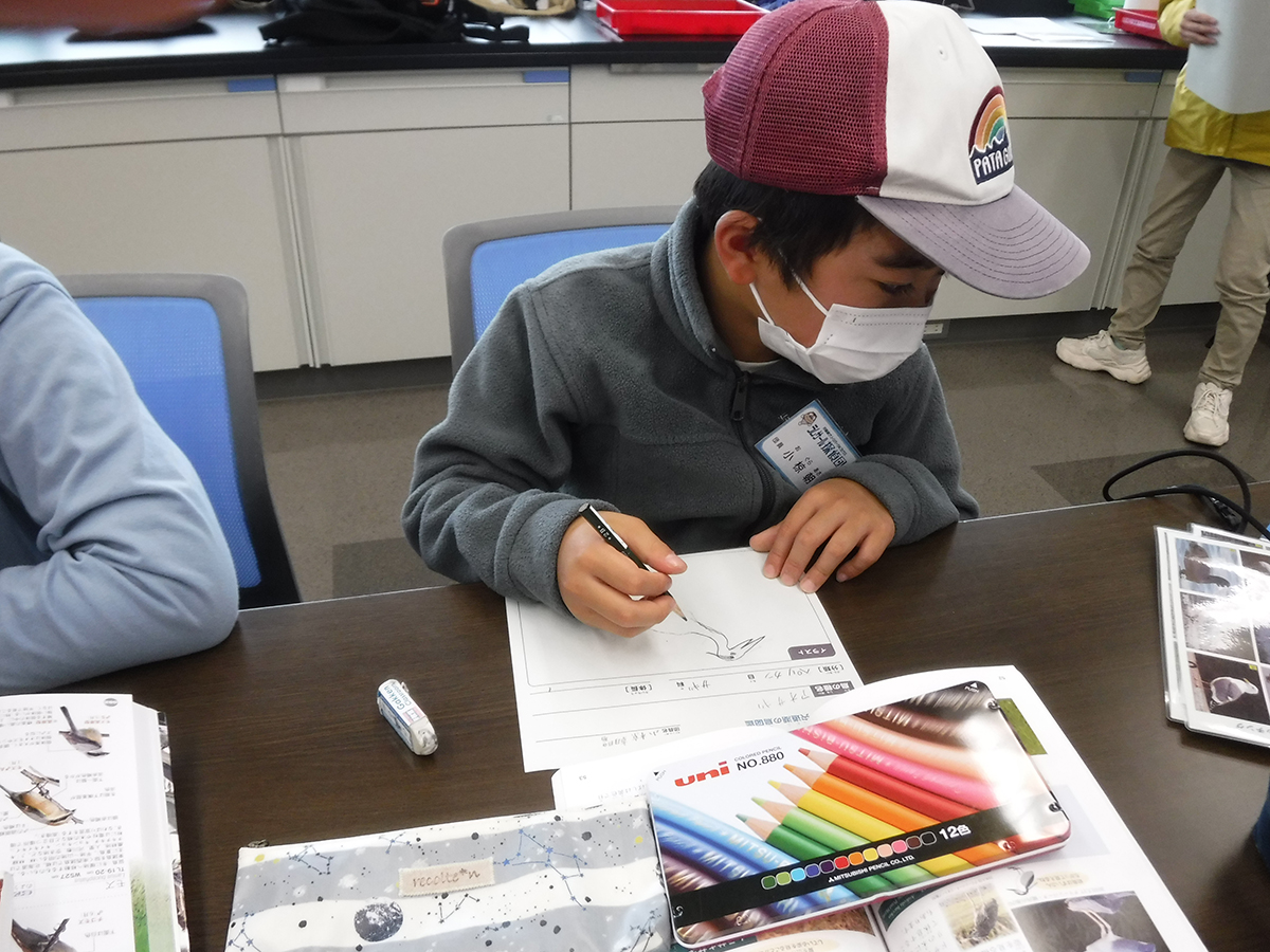 第3回目は、斐伊川や宍道湖の水が流れ着く先である大橋川や中海、境水道の様子を観察しながらバスで境港まで移動しました。その後、海とくらしの史料館で魚介類のはく製の展示を見学したり、スケッチをしたりしました。昼食の後は、米子水鳥公園にて活動しました。バードウォッチングや展示見学をさせていただきながら、神谷館長から中海の自然や野鳥についてのいろいろなお話をうかがいました。さらに世界的に活躍されている鳥類イラストレーター、谷口高司先生から鳥の描き方を教えていただきました。