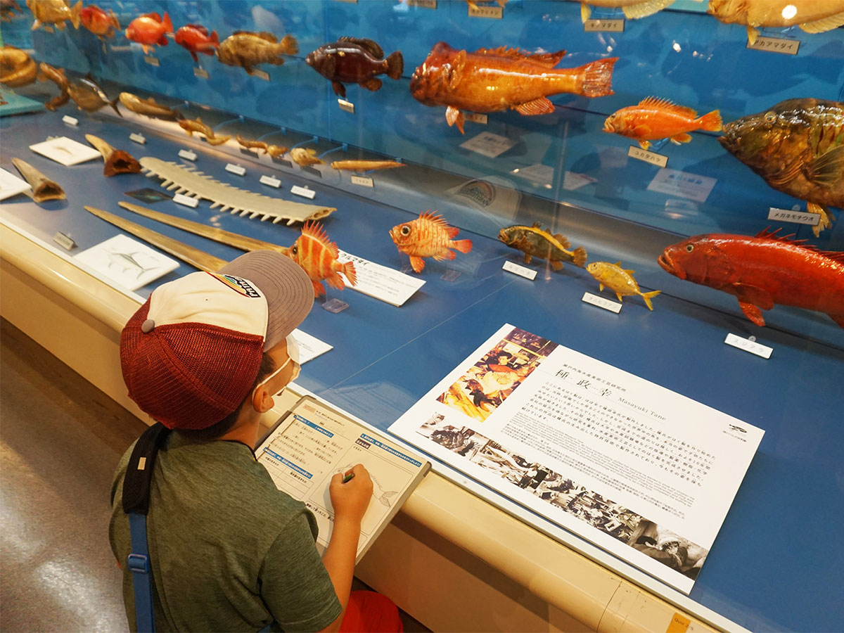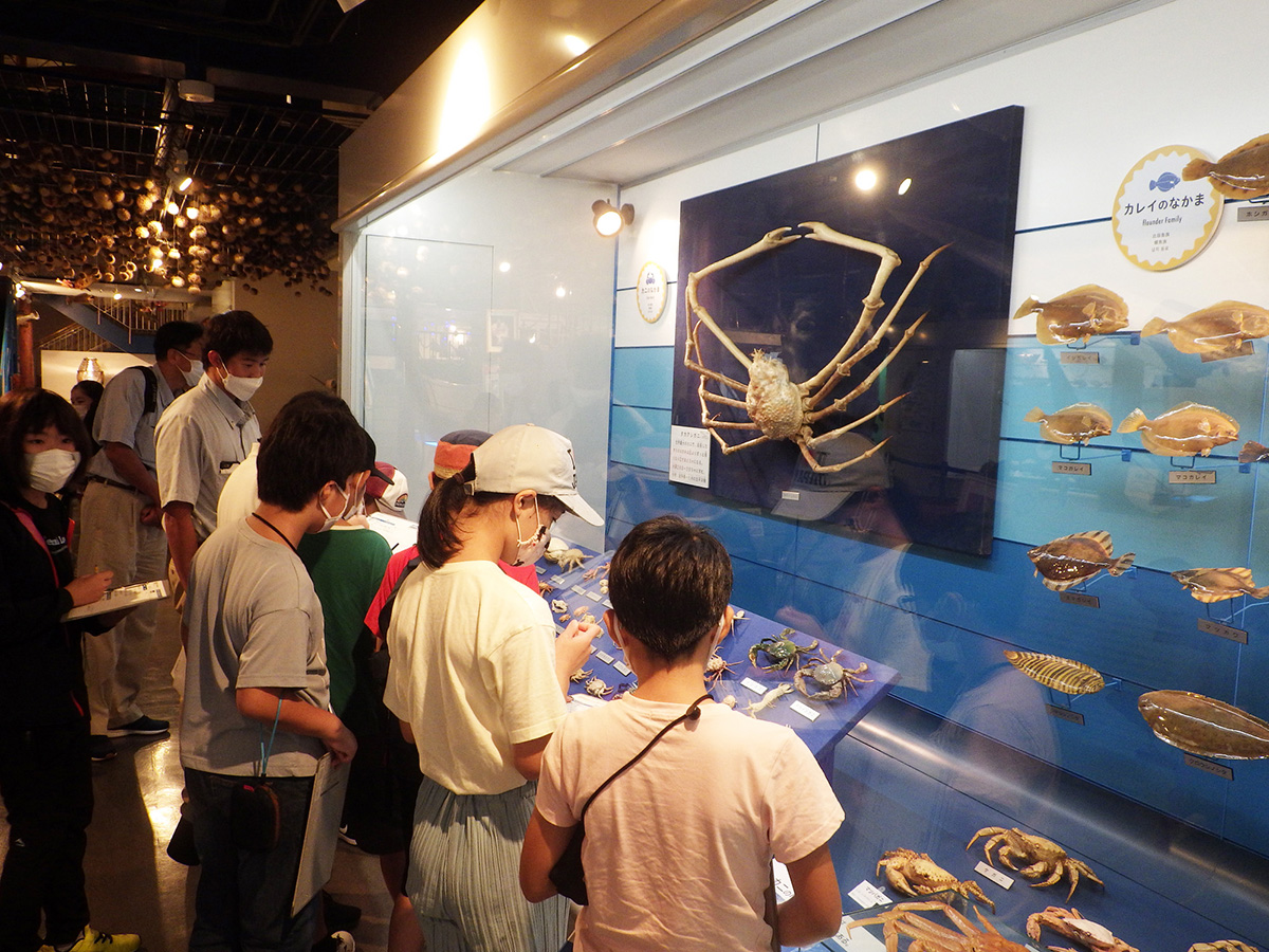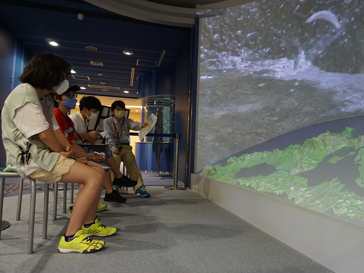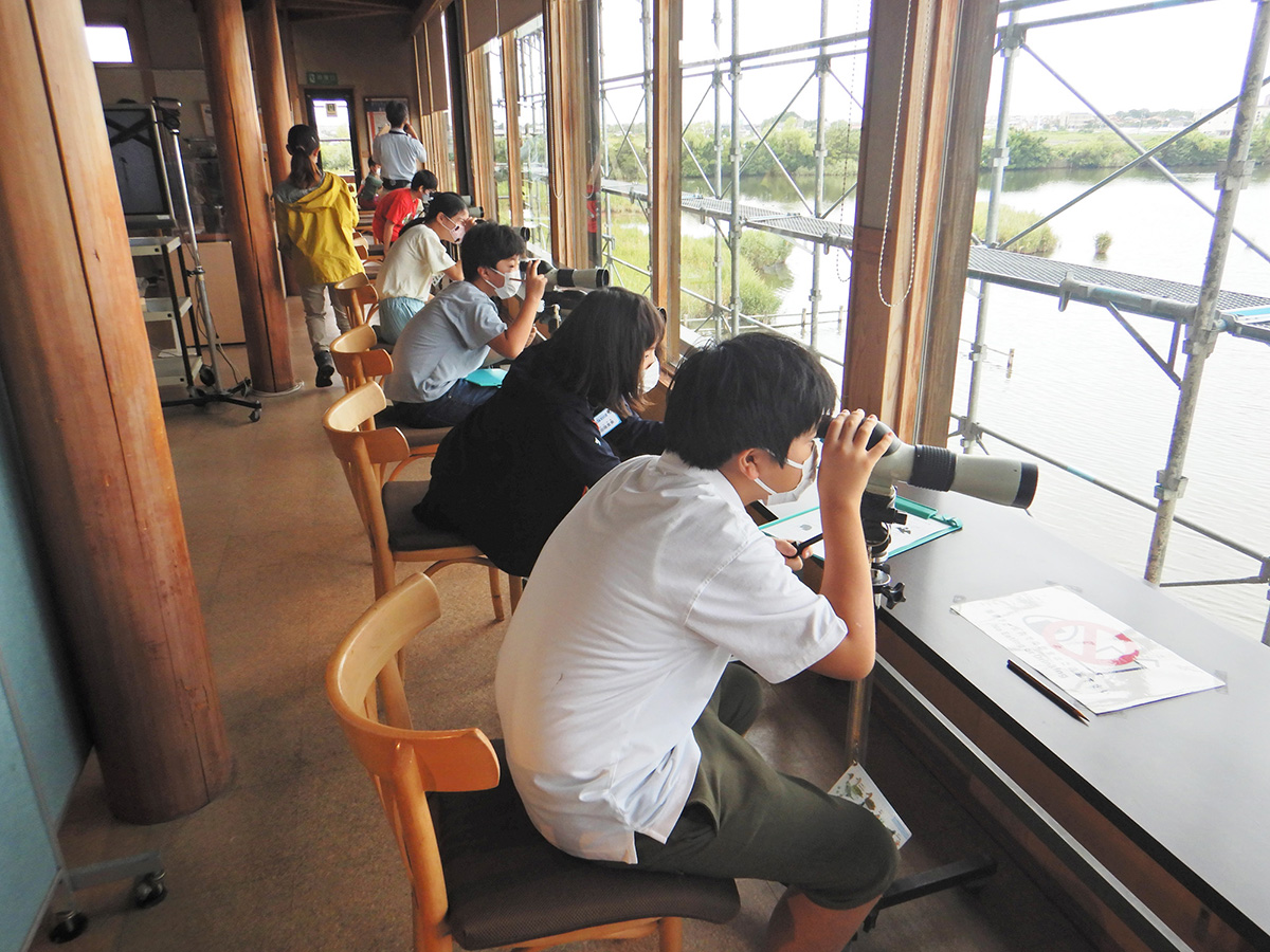 第3回目は、斐伊川や宍道湖の水が流れ着く先である大橋川や中海、境水道の様子を観察しながらバスで境港まで移動しました。その後、海とくらしの史料館で魚介類のはく製の展示を見学したり、スケッチをしたりしました。昼食の後は、米子水鳥公園にて活動しました。バードウォッチングや展示見学をさせていただきながら、神谷館長から中海の自然や野鳥についてのいろいろなお話をうかがいました。さらに世界的に活躍されている鳥類イラストレーター、谷口高司先生から鳥の描き方を教えていただきました。