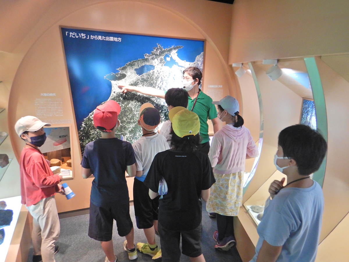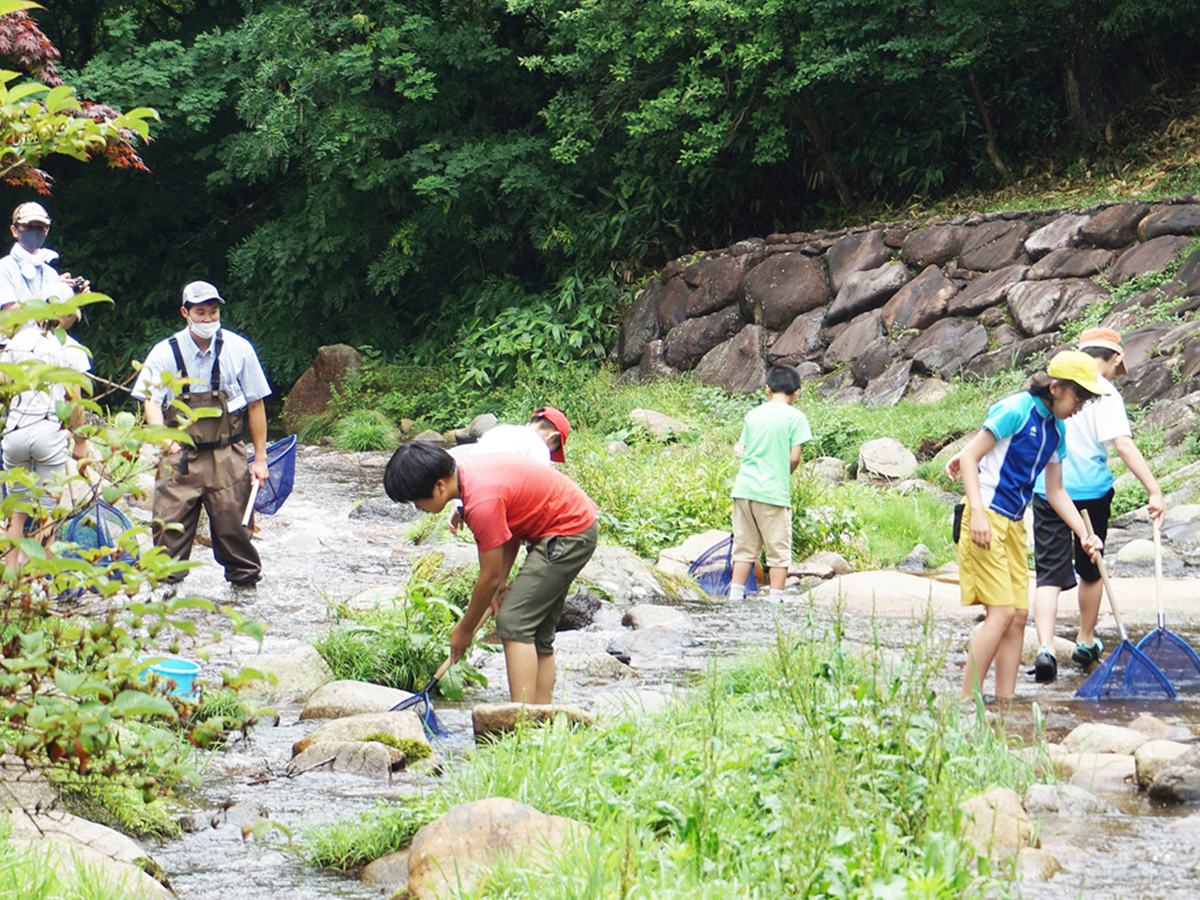 第2回目は、宍道湖の水のおもな供給源である斐伊川の上流に移動して活動しました。斐伊川の様子を観察しながらバスで上流まで移動し、奥出雲横田わくわくプール付近の川で生きものの採集と観察を行いました。ヘビトンボの幼虫やタカハヤの稚魚など、川の上流ならではの生きものを観察することができました。その後、奥出雲多根自然博物館にて、菅田副館長から、宍道湖や中海の成り立ちについてのお話をうかがったり、宍道湖の砂に含まれる鉱物の観察や標本作りについてレクチャーを受けたりしました。