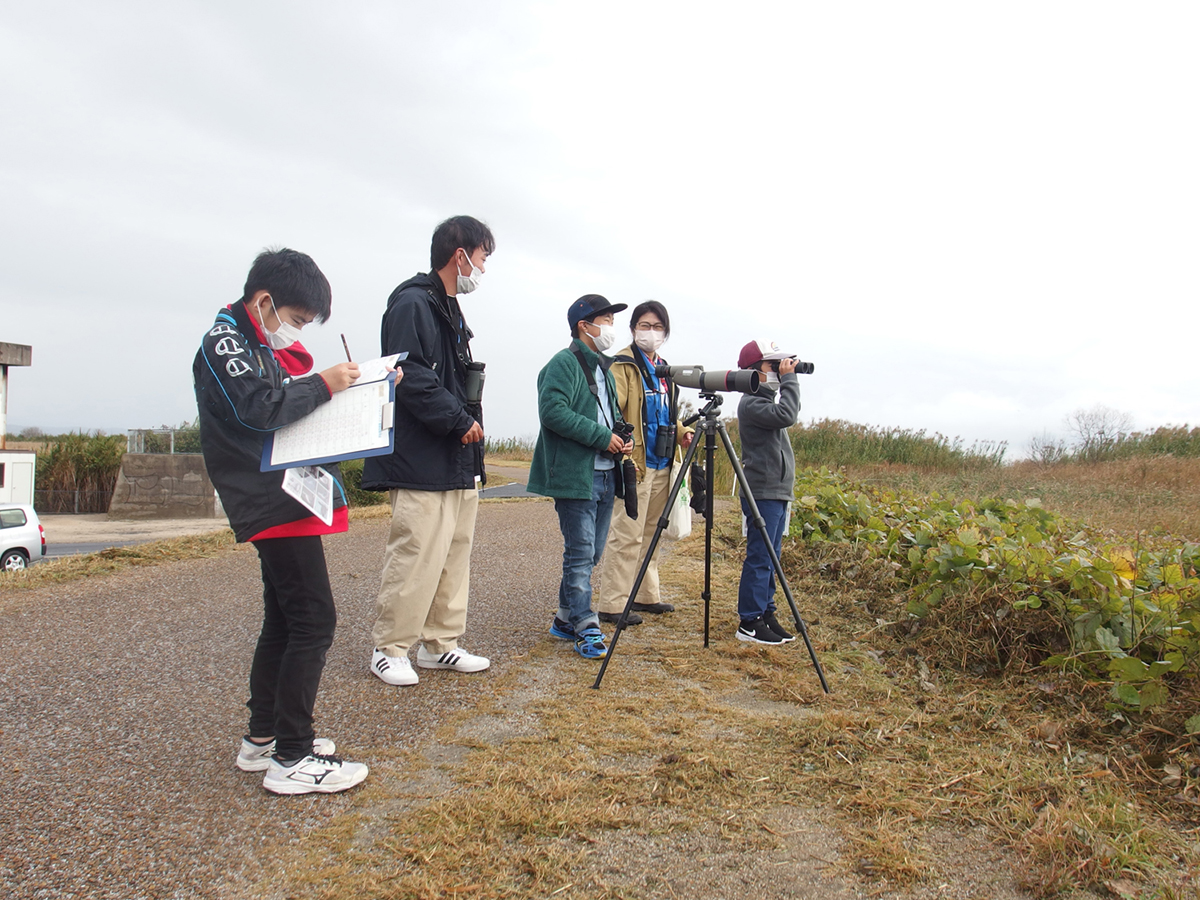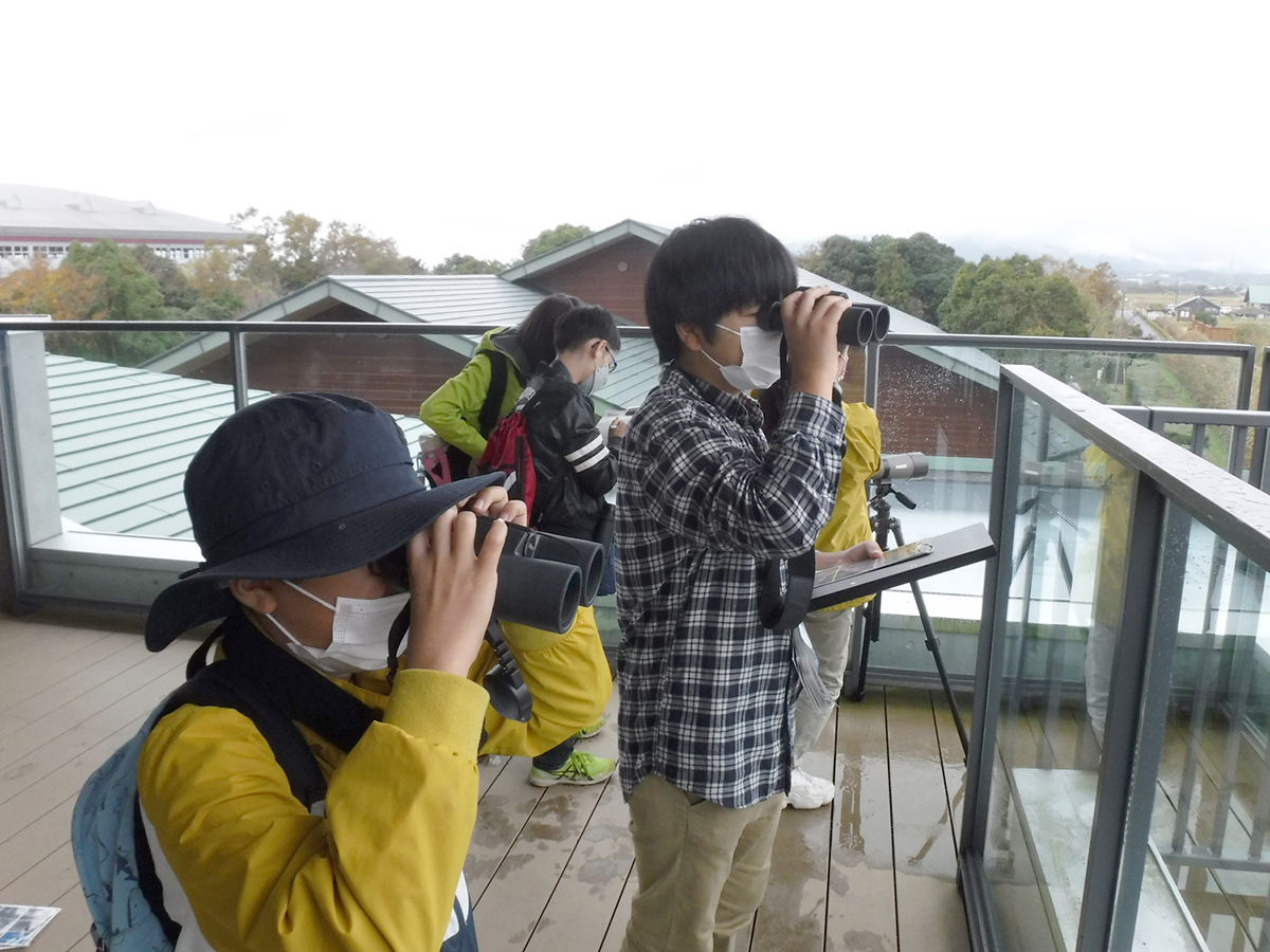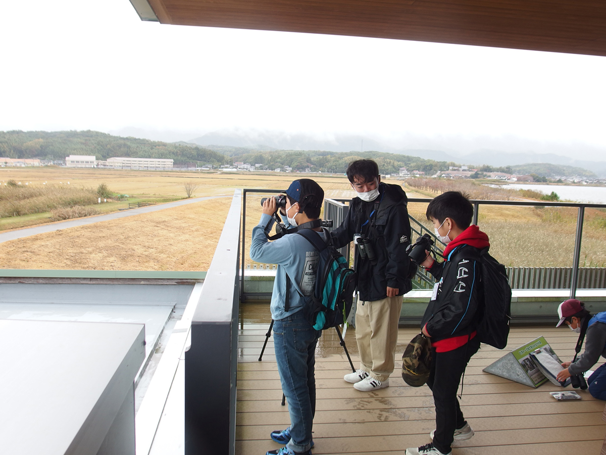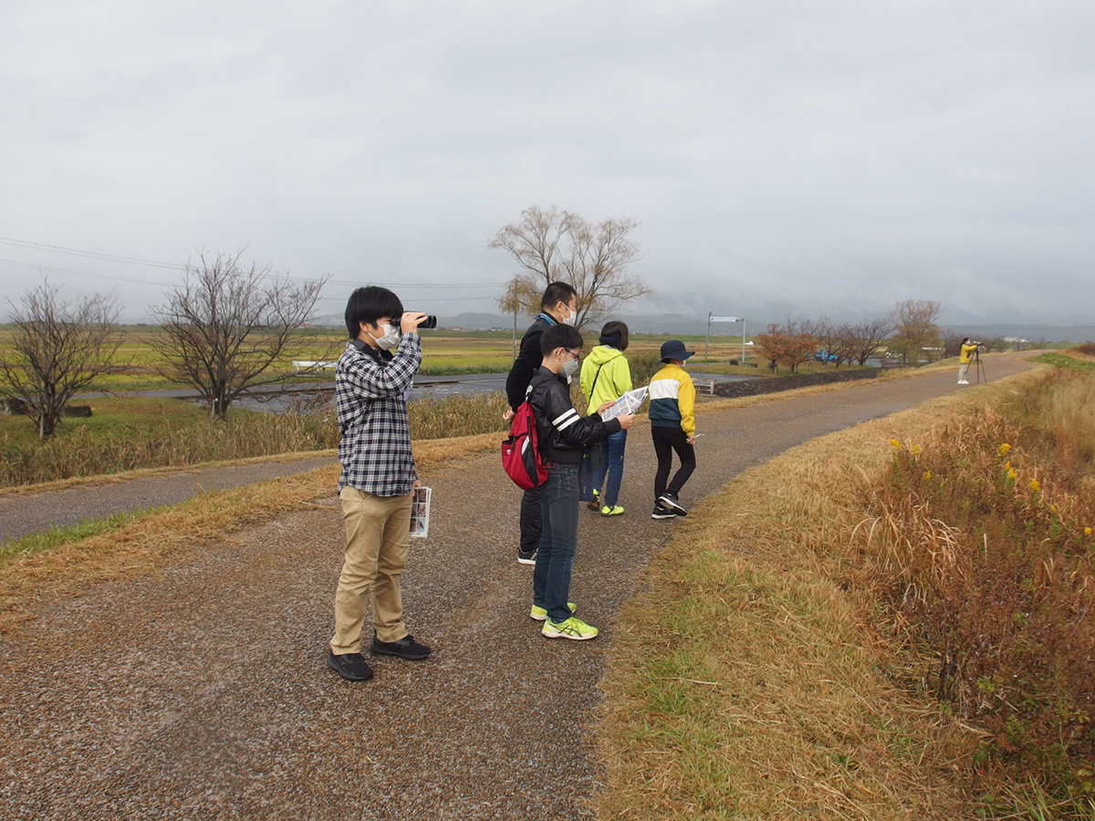 第4回目は、午前中、斐伊川河口やグリーンパークの周辺でバードウォッチングを行いました。しばしば小雨が降る中での活動となりましたが、コハクチョウやマガン、ハヤブサなど28種類の野鳥を観察することができました。午後からはバードウォッチングの結果をまとめた後、気づいたことを発表しあったり、鳥を紹介するカードを作成したりしました。また、次回の活動報告会に向けて、宍道湖・中海・斐伊川と人との関わりについて考え、発表しあったりもしました。