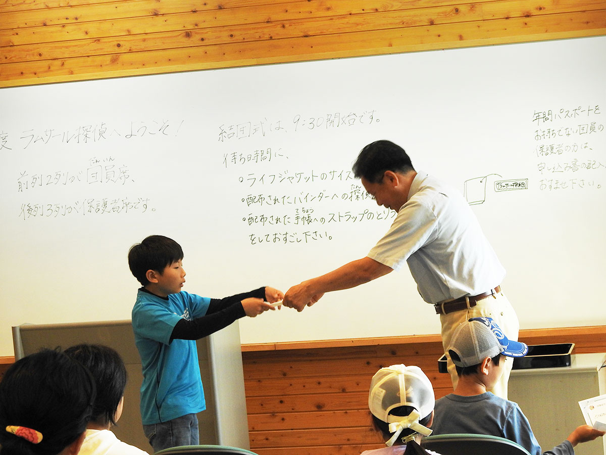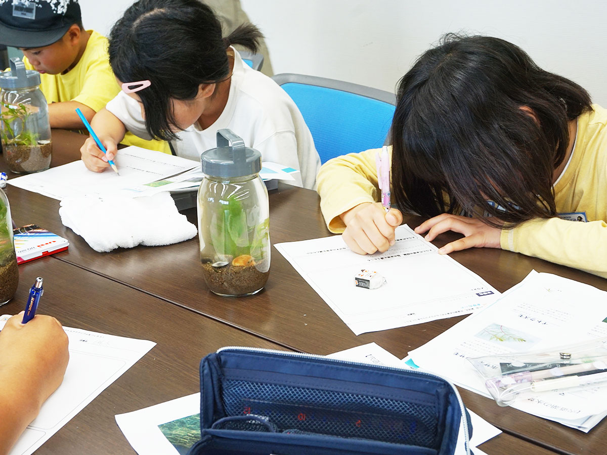 令和5年度ラムサール探偵団が始まりました。小学4年生から中学1年生までの計15名が団員として集まりました。 第1回目は、結団式から始まりました。依頼状に書かれた今年度の団員へのお題は、「あなたが見つけた宍道湖のとっておきの秘密を教えてください。」です。バスで出かける回もあり、宍道湖をいろいろな角度から観察・探索していきます。各回を通して、団員それぞれの宍道湖のとっておきの秘密を見つけてくれることを楽しみにしています。 結団式のあとは、宍道湖やラムサール条約について話を聞きながら、ゴビウスを見学しました。午後は、みなもかんの辻井氏を講師として招き、宍道湖の水草について学びました。宍道湖の水草を採集し、その水草を使ってボトルアクアリウムを作りました。どんな水草があったのか、どんな役割があるのか話を聞き、スケッチし、宍道湖の水草について思ったことを発表しました。