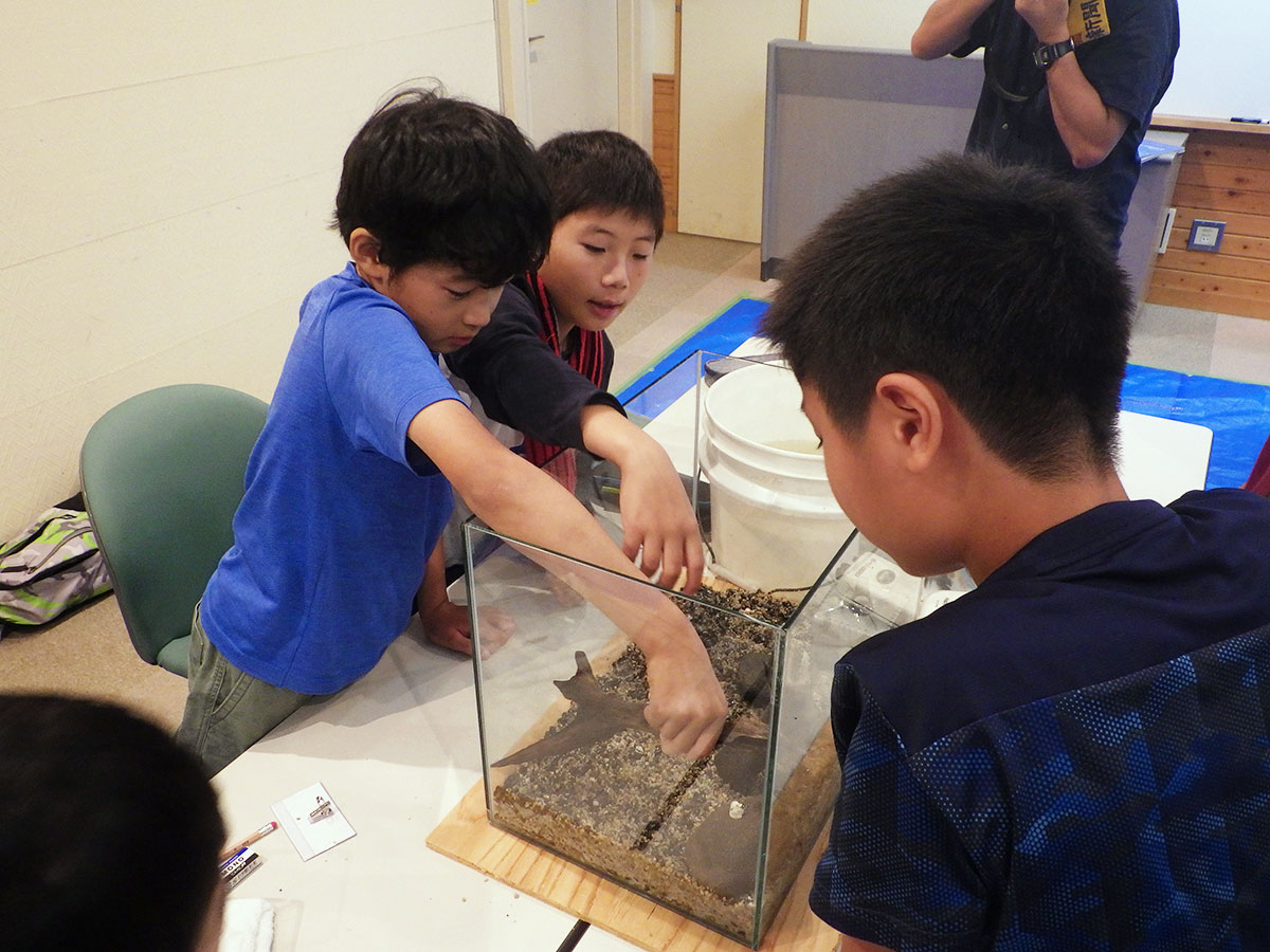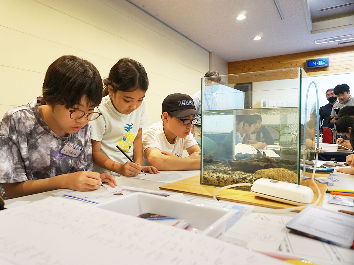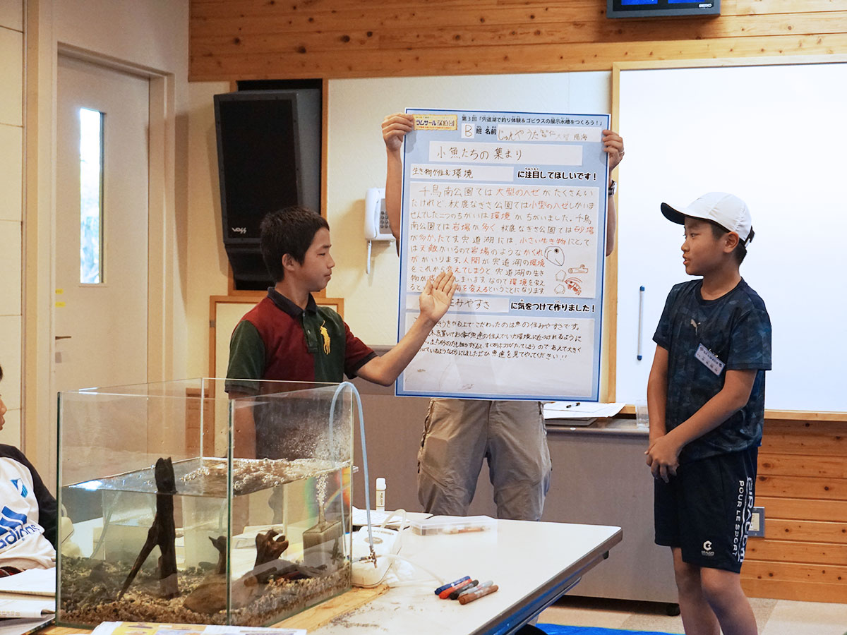 第3回目は、宍道湖北東岸にある千鳥南公園と北岸にある秋鹿なぎさ公園へ移動して活動しました。千鳥南公園では釣り竿、秋鹿なぎさ公園ではたも網を使用して、生きもの採集を行いました。ゴビウスへ戻ってきてから、採集した生きものを場所別に調べ、採集の仕方や環境による違いを知ることができました。ゴビウスで展示をするため、班ごとで相談し、宍道湖の環境をイメージして水槽を作成しました。採集や生きもの調べでわかったことや水槽作りで気をつけたことを解説パネルにまとめ、展示する生きものをイラストで示した種名板も用意しました。採集から学んだことを人に伝える展示づくりまで、幅広い活動をすることができました。作成した水槽とパネルは10月2日までゴビウスで展示予定です。