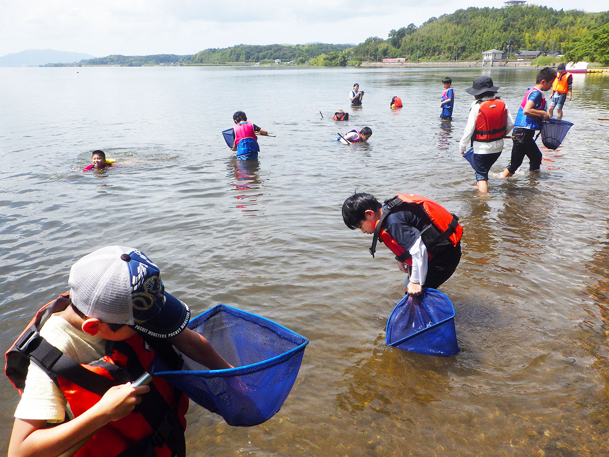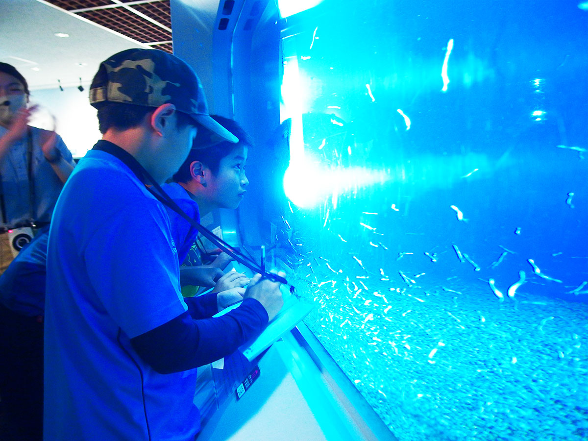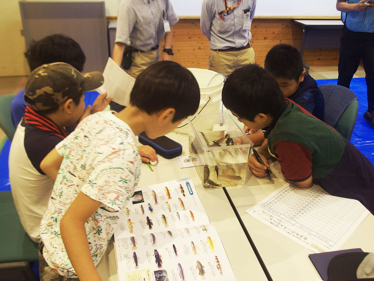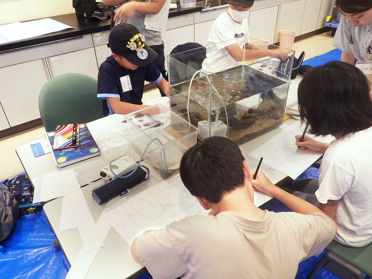 第3回目は、宍道湖北東岸にある千鳥南公園と北岸にある秋鹿なぎさ公園へ移動して活動しました。千鳥南公園では釣り竿、秋鹿なぎさ公園ではたも網を使用して、生きもの採集を行いました。ゴビウスへ戻ってきてから、採集した生きものを場所別に調べ、採集の仕方や環境による違いを知ることができました。ゴビウスで展示をするため、班ごとで相談し、宍道湖の環境をイメージして水槽を作成しました。採集や生きもの調べでわかったことや水槽作りで気をつけたことを解説パネルにまとめ、展示する生きものをイラストで示した種名板も用意しました。採集から学んだことを人に伝える展示づくりまで、幅広い活動をすることができました。作成した水槽とパネルは10月2日までゴビウスで展示予定です。