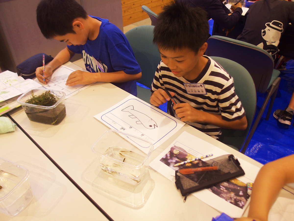 令和6年度のラムサール探偵団は6月8日の結団式から始まりました。依頼状に書かれた今年度の団員へのお題は、「こうなってほしい!10年後の宍道湖・中海の姿」です。計5回の活動を通じて、宍道湖についてさまざまなことを調べたり、考えたりして答えを導き出していきます。結団式の後は、ゴビウス館内を見学したり、座学で水槽の立ち上げ方・レイアウトのコツを聞いたりしました。午後からは、宍道湖周辺で生きものを採集し、午前に学んだことを活かして、班ごとに水槽の立ち上げを行いました。団員同士で協力して、採集した生きものの名前を調べ、イラストを描いてパネルを作成したり、水槽のレイアウトなどについて考えたりしました。その結果、どの班も素晴らしい水槽が完成しました。作ったパネルと水槽は6月12日よりゴビウストピックコーナーにて展示しています。