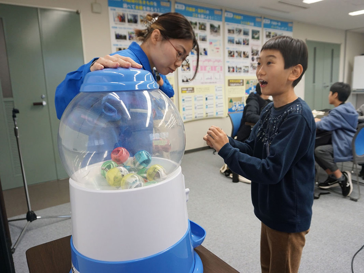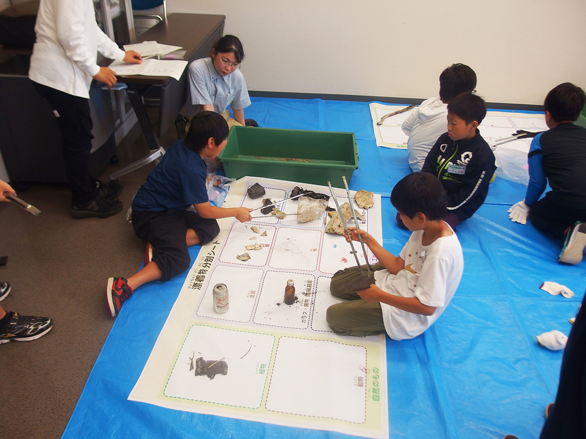 第2回目は、午前中、宍道湖の水のおもな供給源である斐伊川の中流にある「天が淵」、下流にある「斐伊川河川敷公園」、宍道湖の西岸にある「斐川なぎさ公園」の3つの地点をバスで巡り、それぞれに流れ着いたゴミを拾い集めました。移動中のバスの中では、宍道湖や斐伊川の自然についての○×クイズなどで盛り上がりました。午後は、集めたゴミを地点毎に分別し、その種類や量を調べました。その後、班ごとに結果を整理し、調べて分かったことや、ゴミを減らすための方法を考えて、発表してもらいました。