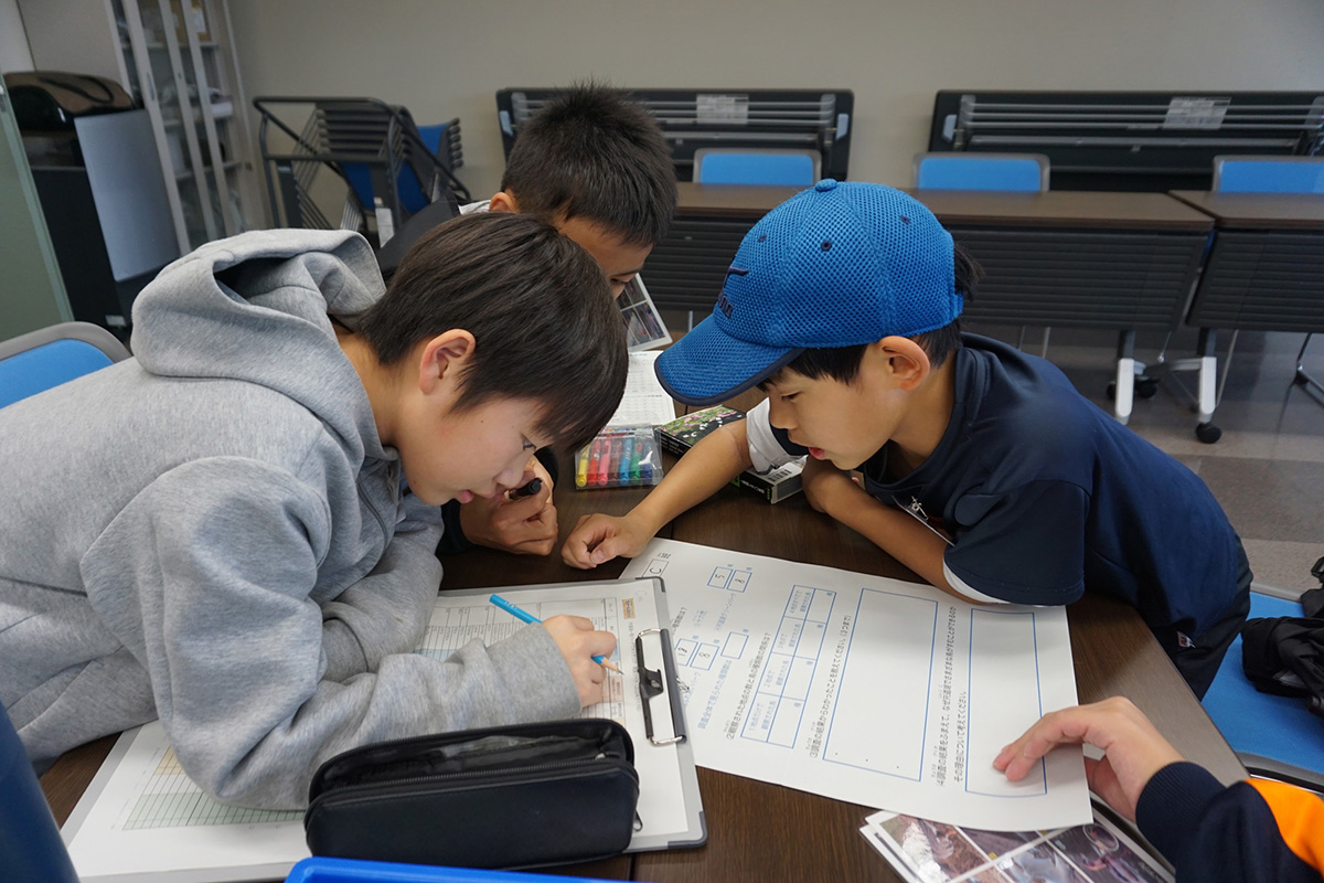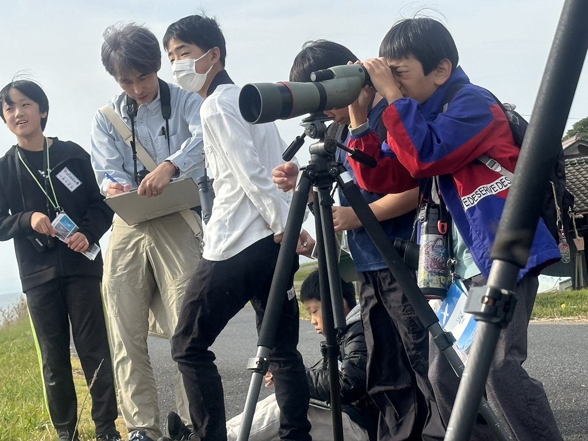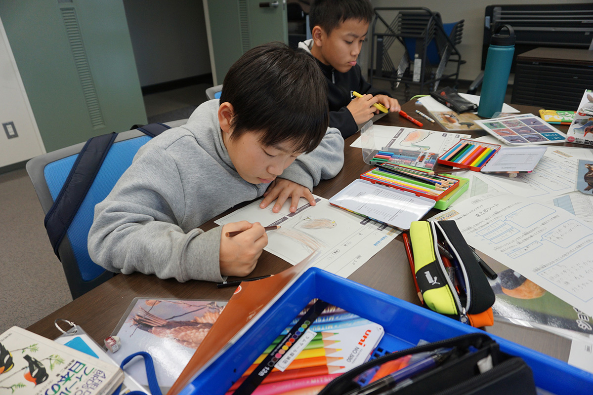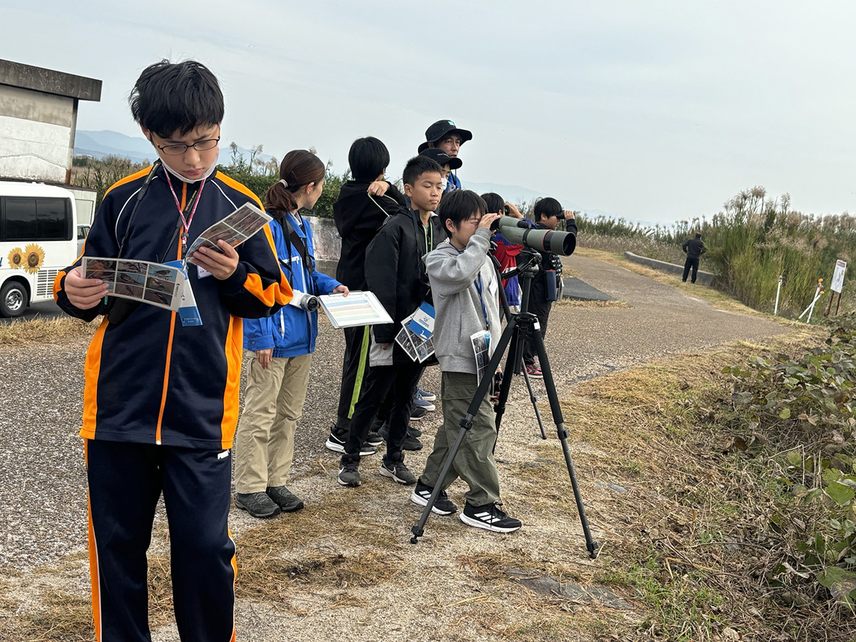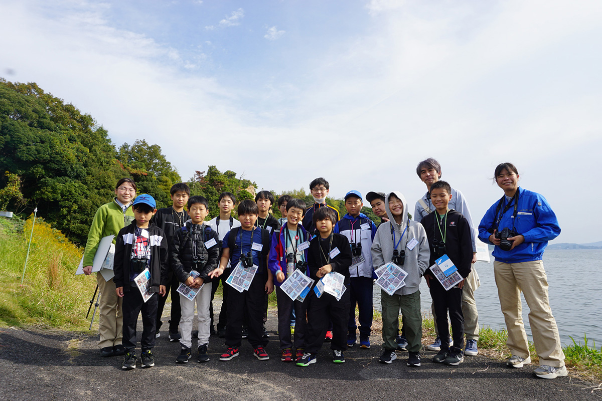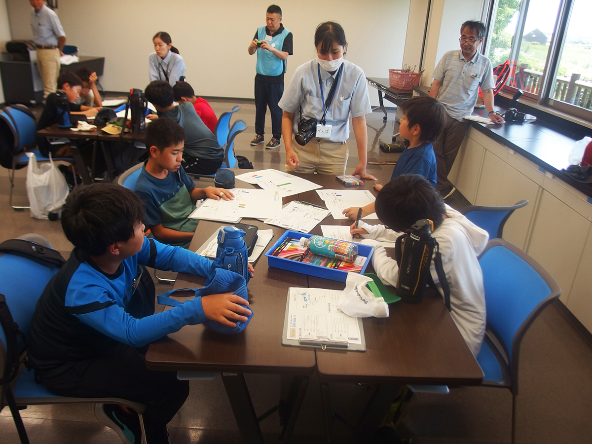 第4回目は、午前中、バスで宍道湖を一周しながら、斐伊川河口、宍道湖ふれあいパーク、十六禿、宍道湖グリーンパークの4地点でバードウォッチングを行いました。各観察地点では景観などについても記録し、生息する野鳥との関係について調べました。一連のバードウォッチングを通して、合計50種の野鳥を観察することができました。 午後は、観察結果からわかったことを班ごとにまとめて発表したり、観察された野鳥をイラストや文章で紹介するシートを作成したりしました。団員の皆さんの発表やふりかえりからは、宍道湖の自然の豊かさや、環境とすんでいる野鳥の種類に関係があることを実感したことが伝わってきました。