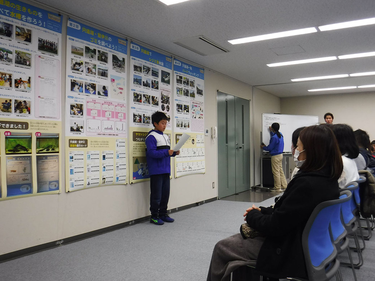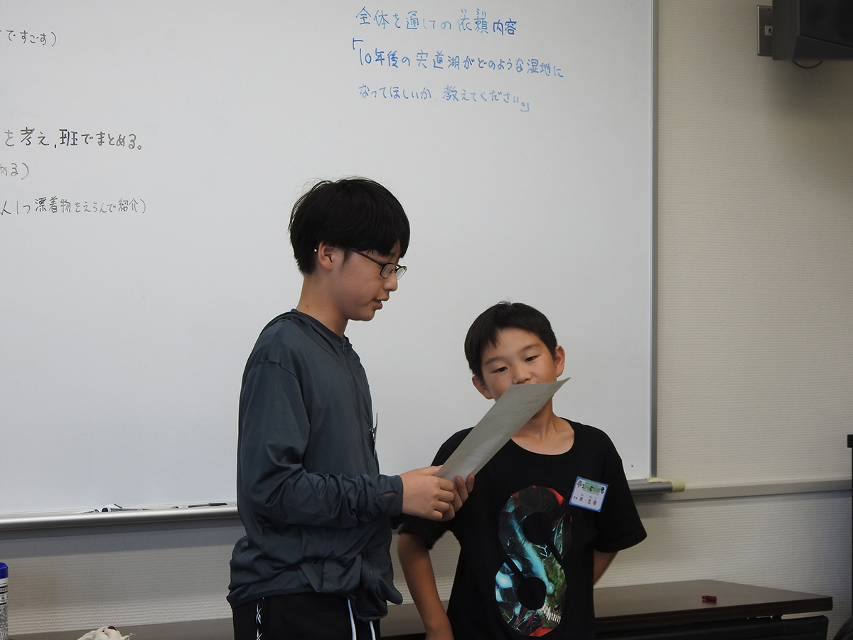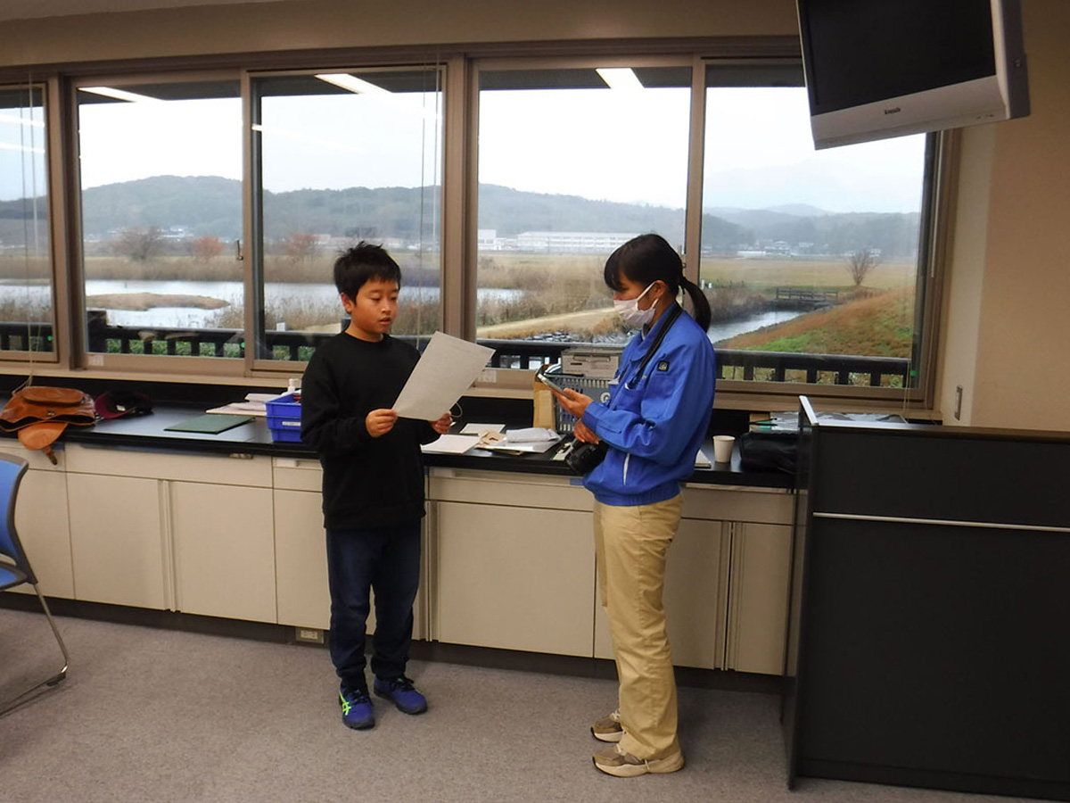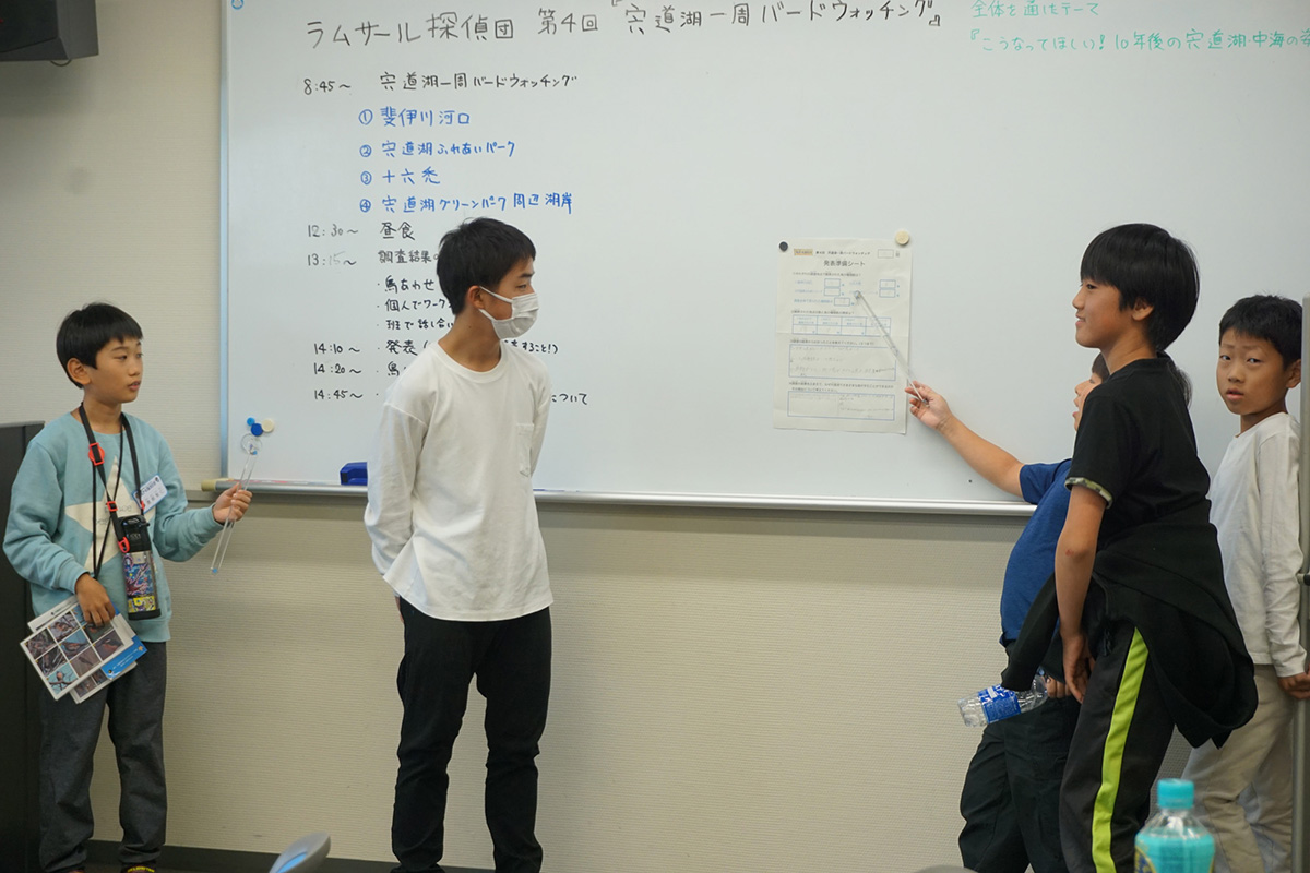 今年度の探偵団の締めくくりとして活動報告会を行いました。午前中はこれまでの活動を振り返ったり、ラムサール条約について学んだことをおさらいしたりした上で、発表のための準備や練習をしました。午後の活動報告会では、団員一人ひとりに活動を通して印象に残ったこと、発見したことなどを説明してもらったほか、今年度の依頼だった「10年後の宍道湖がどのような湿地になって欲しいか」に対する答えも発表してもらいました。団員たちからは「ゴミが落ちていない宍道湖になって欲しい」、「水鳥などの生きものが豊かに暮らせる場所であって欲しい」、「人にとっても生きものにとっても、すみやすい宍道湖であって欲しい」などの回答が聞けたほか、それらの実現に向けて「清掃活動を行いたい」、「たくさんの人に興味・関心をもってもらうため、宍道湖の魅力を伝えたい」など、具体的にこれから取り組むべき活動についての発言もありました。来たるべき未来に宍道湖が理想の姿となるよう、修了後もさまざまなかたちで宍道湖に関わってもらえると嬉しく思います。