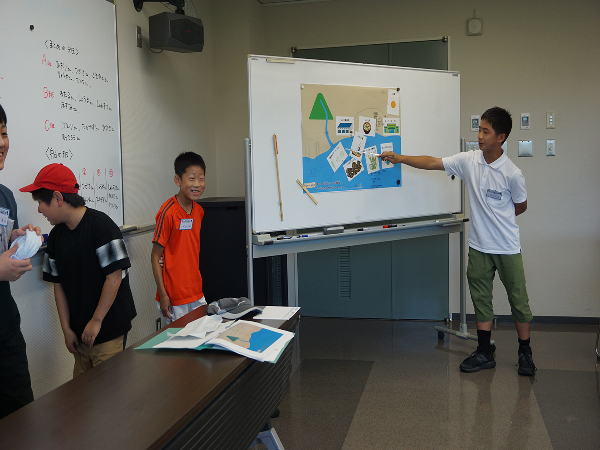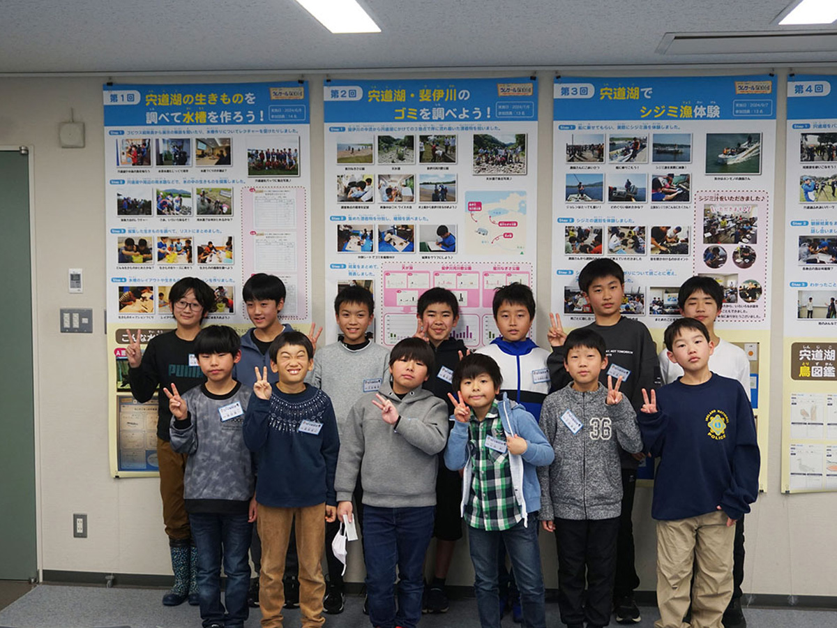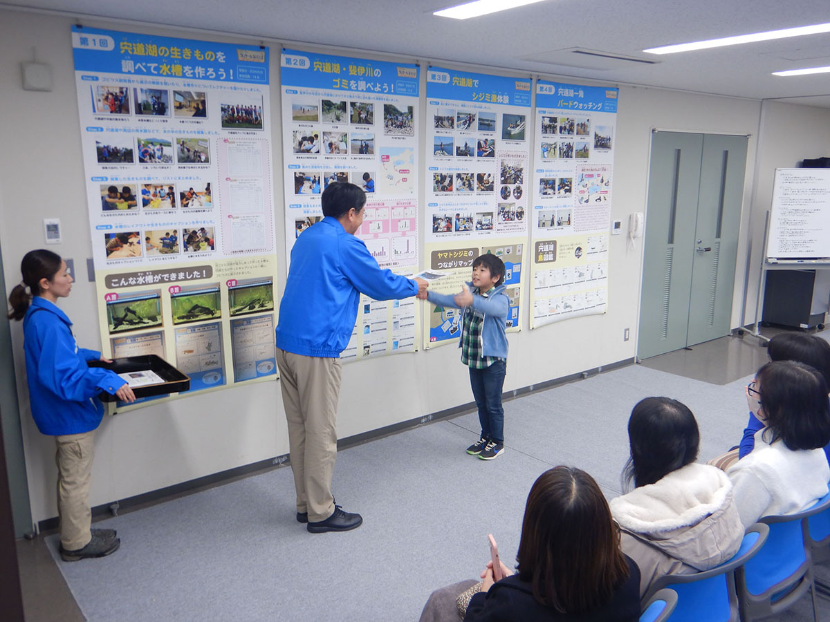 今年度の探偵団の締めくくりとして活動報告会を行いました。午前中はこれまでの活動を振り返ったり、ラムサール条約について学んだことをおさらいしたりした上で、発表のための準備や練習をしました。午後の活動報告会では、団員一人ひとりに活動を通して印象に残ったこと、発見したことなどを説明してもらったほか、今年度の依頼だった「10年後の宍道湖がどのような湿地になって欲しいか」に対する答えも発表してもらいました。団員たちからは「ゴミが落ちていない宍道湖になって欲しい」、「水鳥などの生きものが豊かに暮らせる場所であって欲しい」、「人にとっても生きものにとっても、すみやすい宍道湖であって欲しい」などの回答が聞けたほか、それらの実現に向けて「清掃活動を行いたい」、「たくさんの人に興味・関心をもってもらうため、宍道湖の魅力を伝えたい」など、具体的にこれから取り組むべき活動についての発言もありました。来たるべき未来に宍道湖が理想の姿となるよう、修了後もさまざまなかたちで宍道湖に関わってもらえると嬉しく思います。