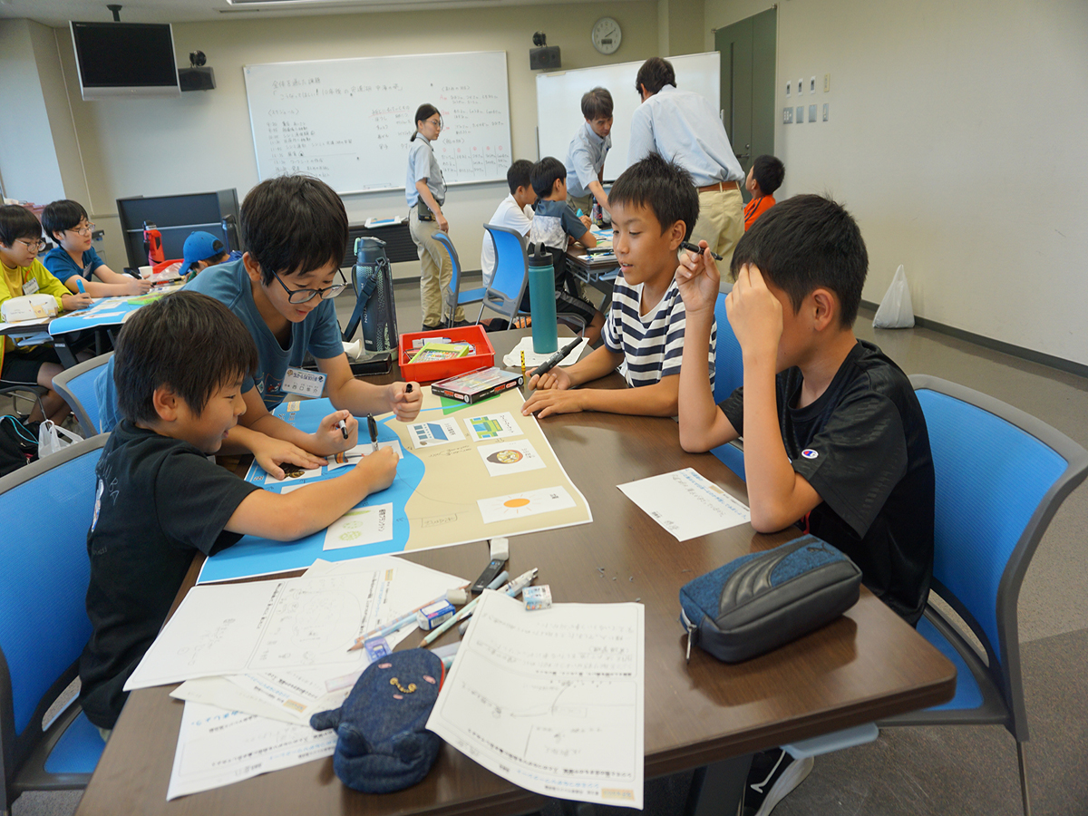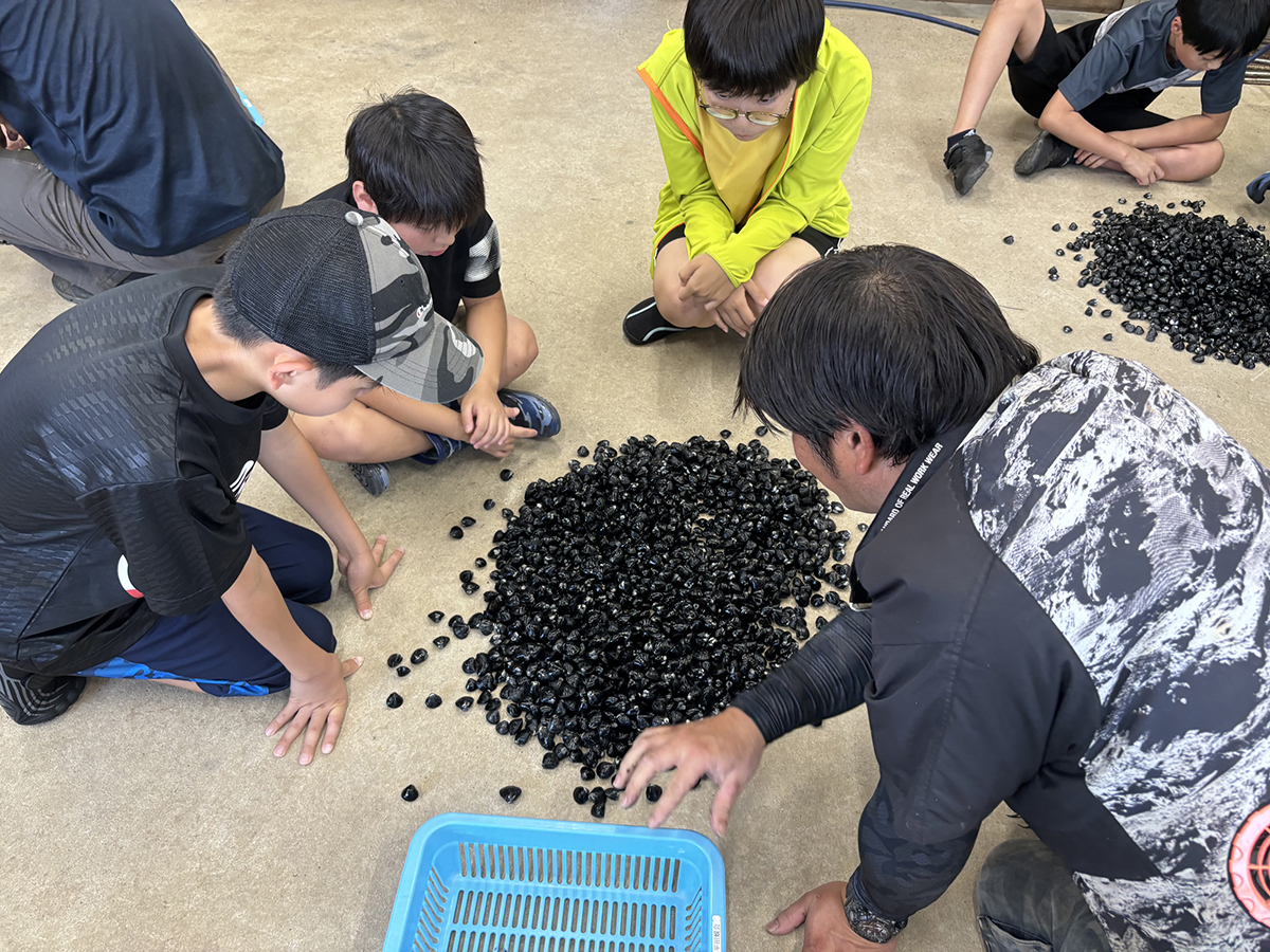 第3回目は、宍道湖でシジミ漁体験を行いました。漁師さんの船に乗せていただき、間近でシジミ漁を見学しました。また、漁師さんのサポートの下、ジョレンという道具を使って実際にシジミ搔きを体験しました。シジミ漁の後は、シジミの選別作業を体験しました。採ったシジミの中から、音の違いを頼りに手作業で殻だけのものを選別していることを学びました。お昼には漁師さん特製の美味しいシジミ汁をいただきました。 午後からは、午前中に体験したことや学んだことを手がかりに、シジミを中心とした人や生きもの、環境とのつながりについて班ごとに話し合い、大きな1枚の紙にまとめ、発表しました。