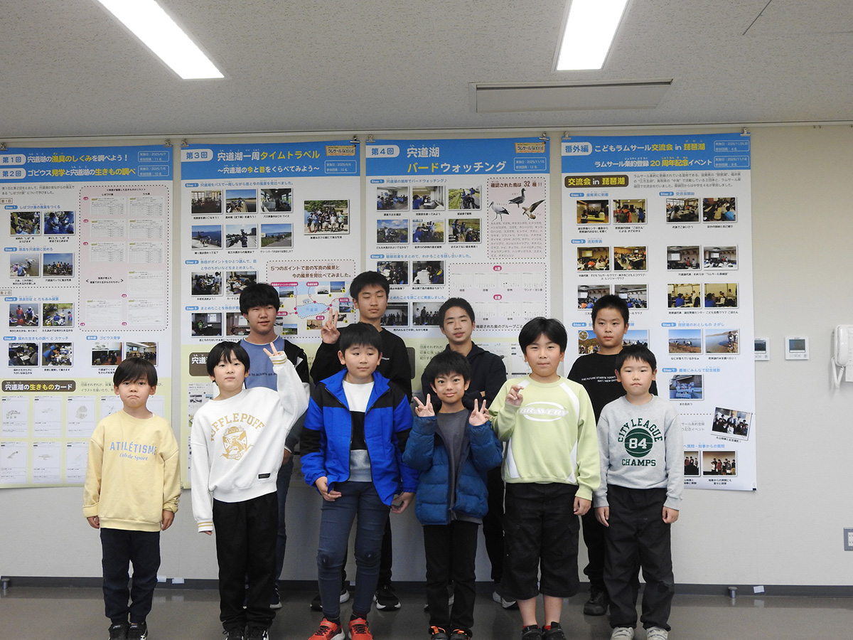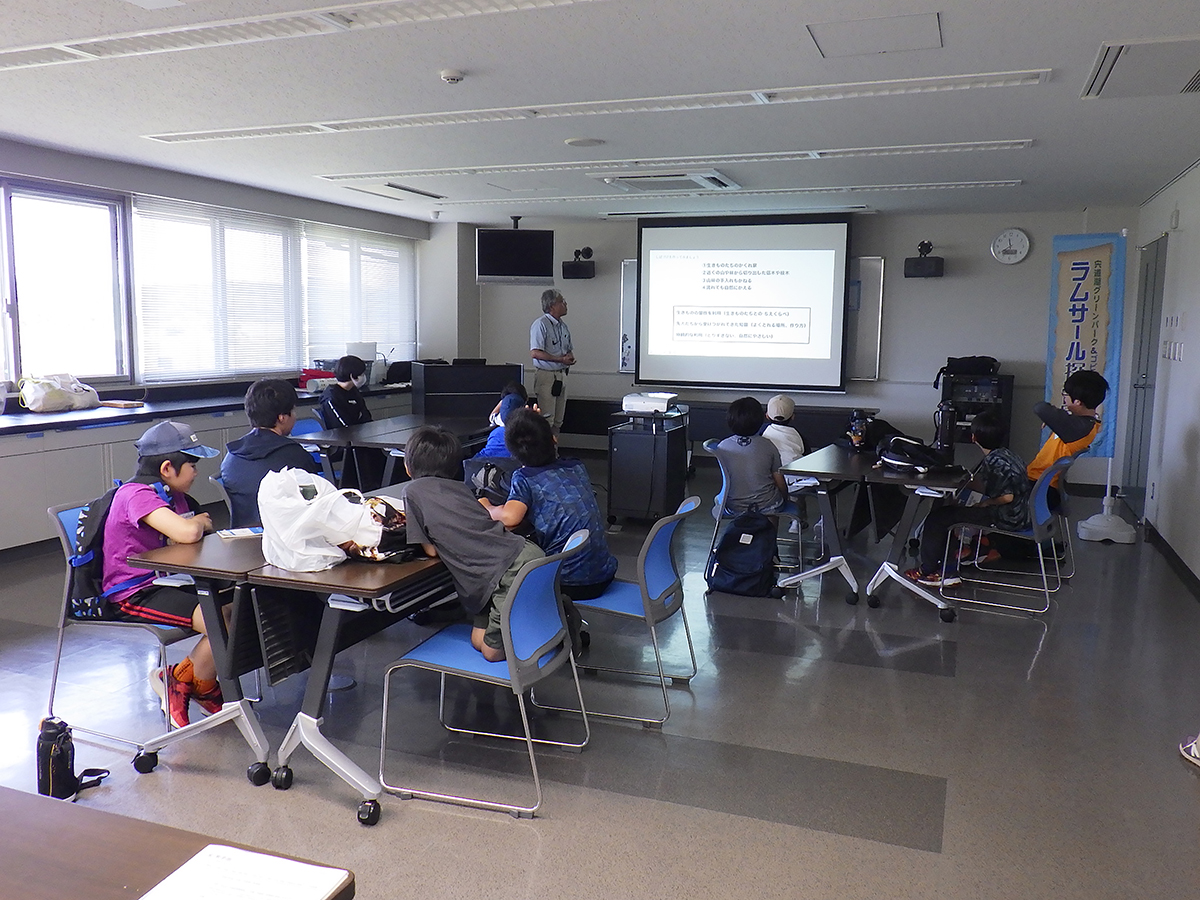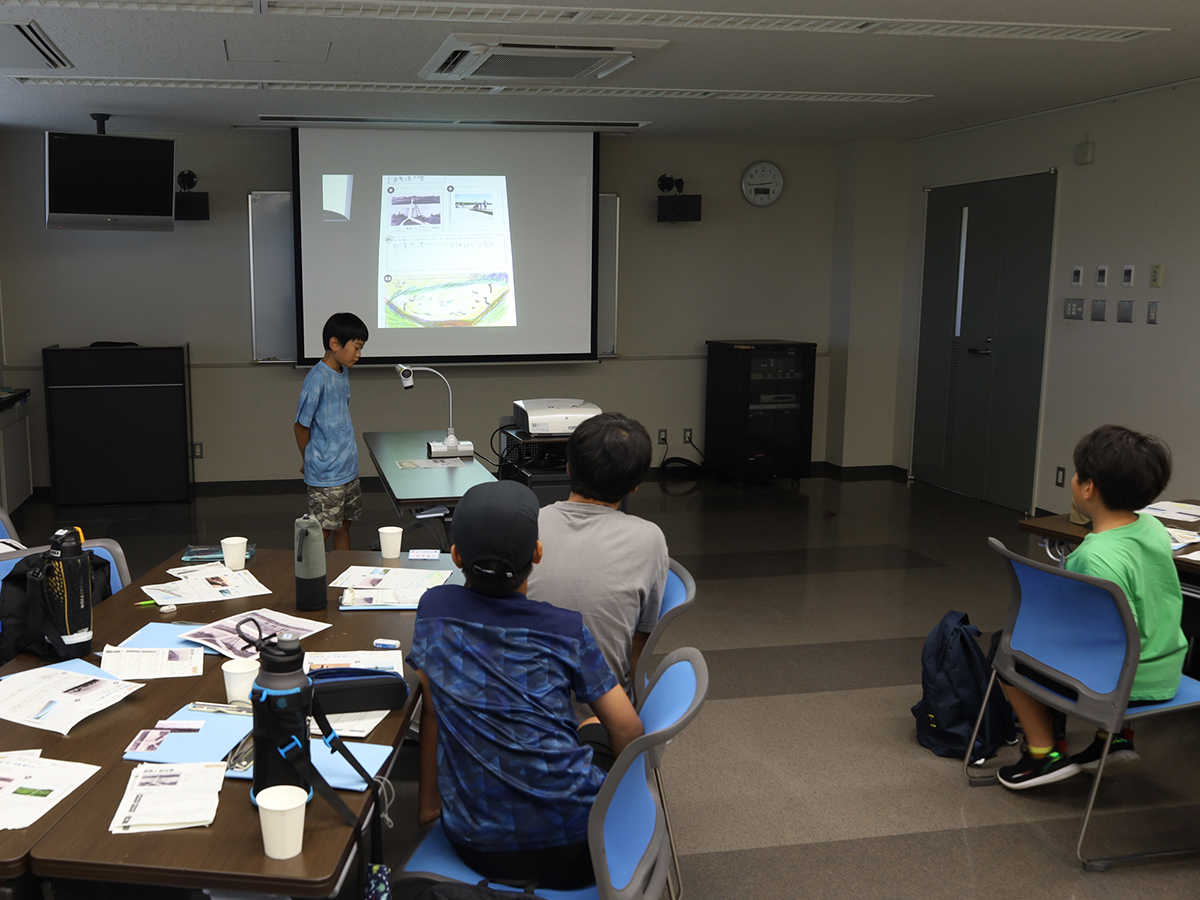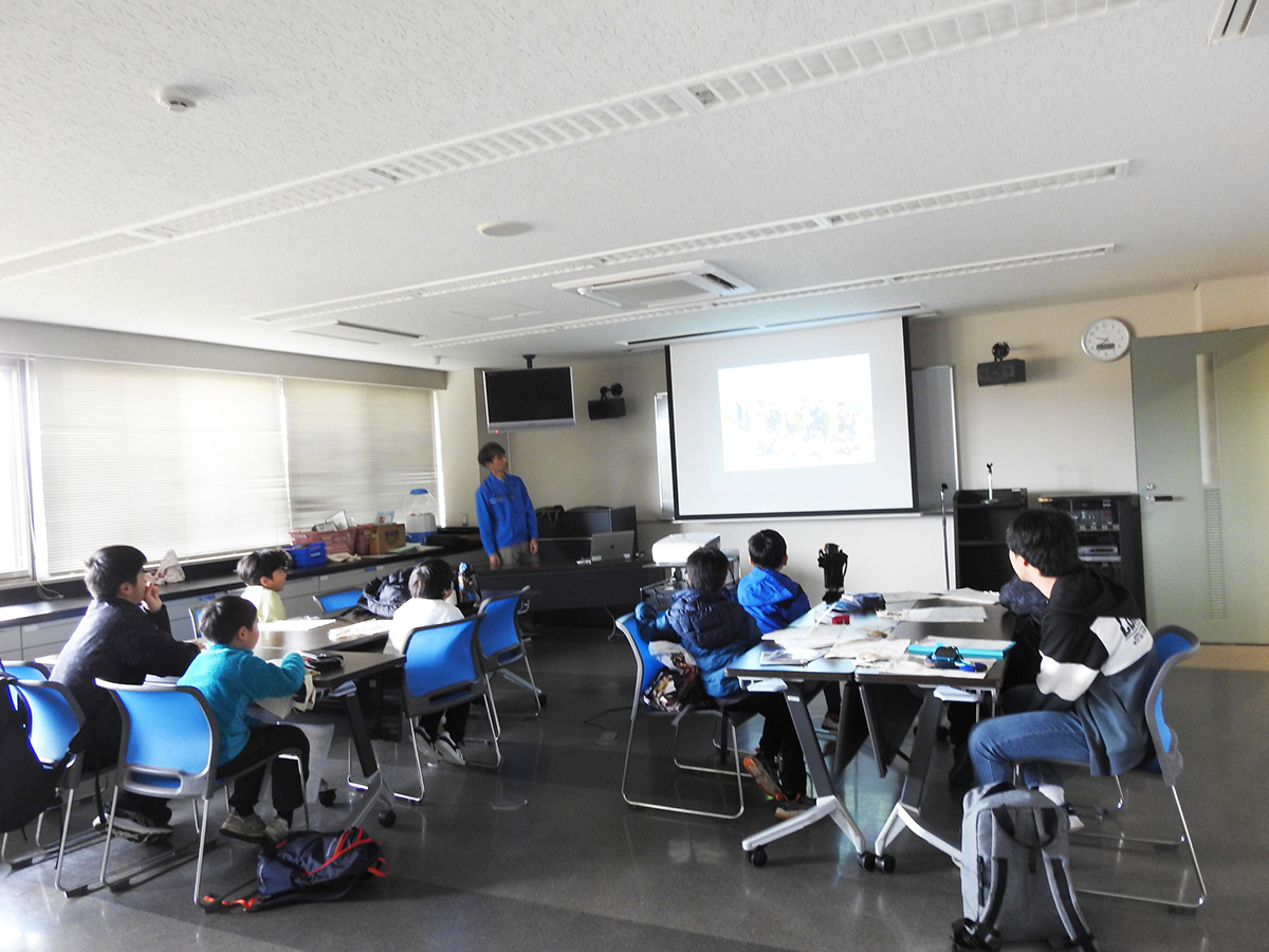 今年度の探偵団の締めくくりとして活動報告会を行いました。午前中はこれまでの活動を振り返ったり、ラムサール条約について学んだことをおさらいしたりした上で、発表のための準備や練習をしました。 午後の活動報告会では、団員一人ひとりに活動を通して印象に残ったこと、発見したことなどを説明してもらったほか、今年度の依頼だった「宍道湖に関するコトやモノの中でこれだけは未来に残したいと思うもの」について発表してもらいました。団員たちからは「たくさんの生きものや自然」、「美しい宍道湖やその景観を守るために活動する人々」、「宍道湖を通して結ばれる絆」といったさまざまな回答が聞けたほか、それらを残していくために「ゴミ拾いをして景観を守る」、「宍道湖の水質検査をする」、「湿地に関わる人たちと交流する」など、自分たちにできることについての発言もありました。 修了後も探偵団での経験を糧に、団員の皆さんが宍道湖の豊かな自然を未来へつなぐ架け橋となってくれることを心より願っています。