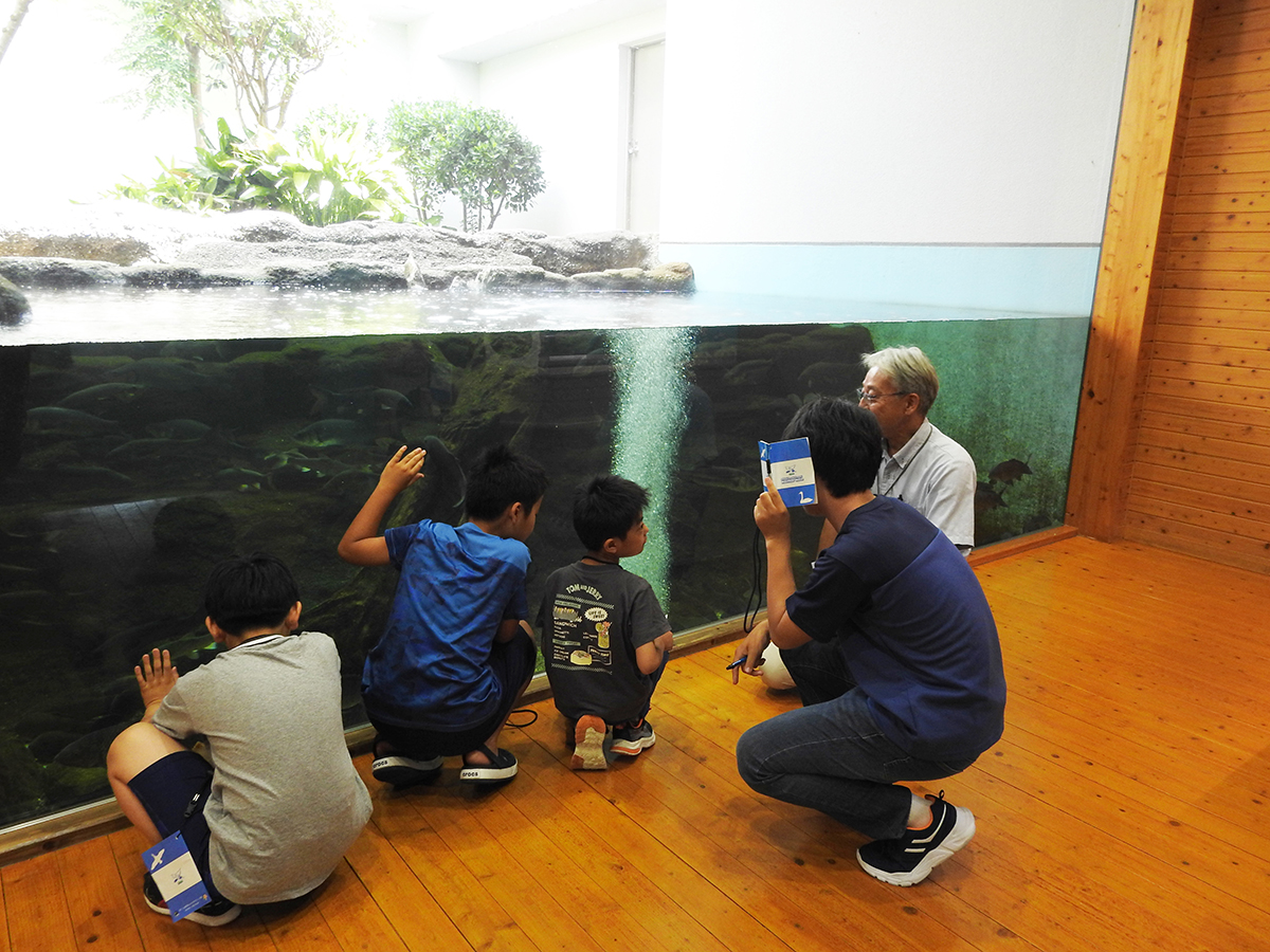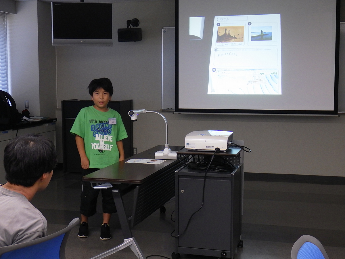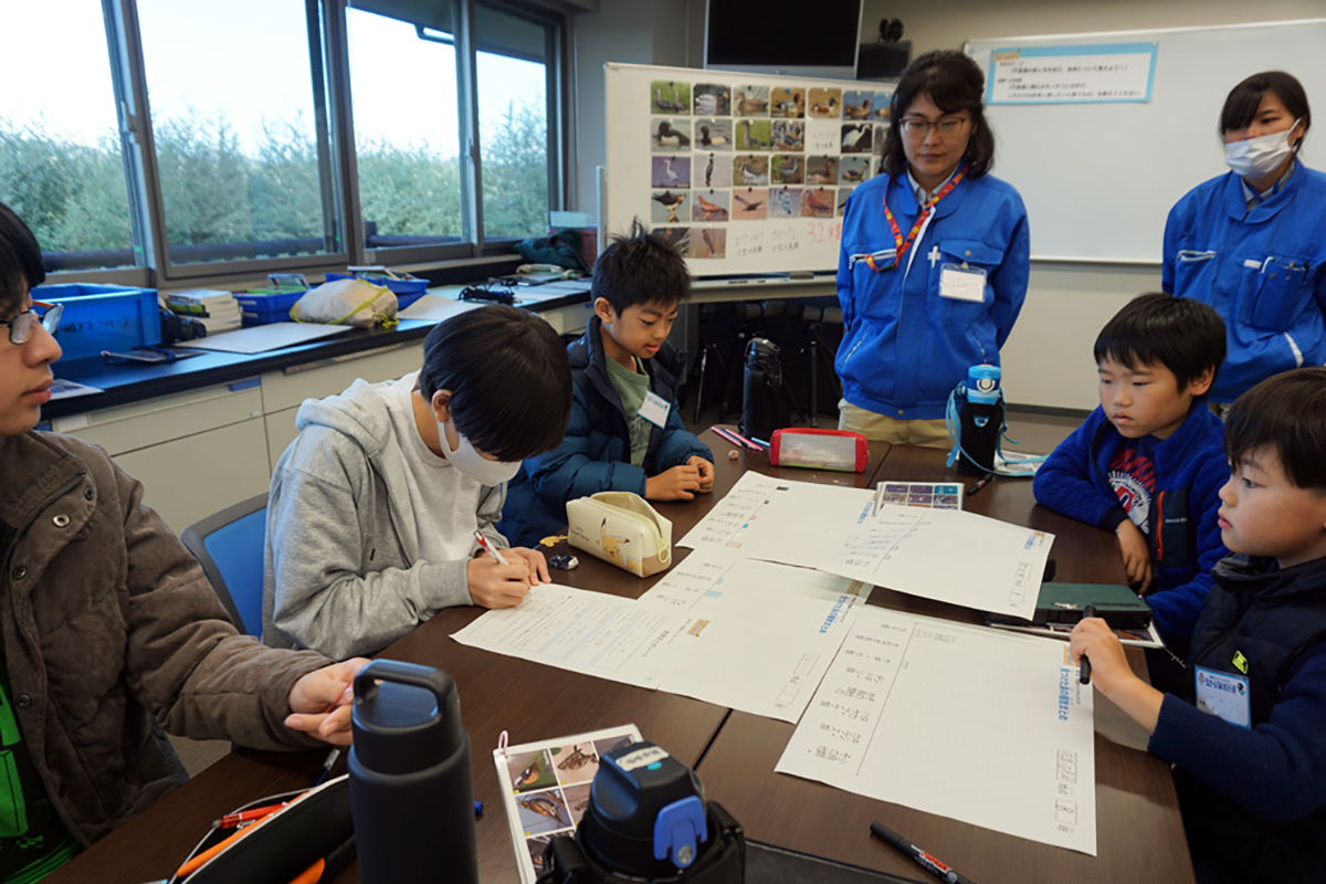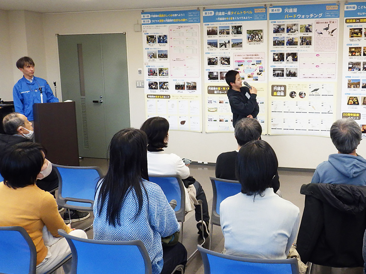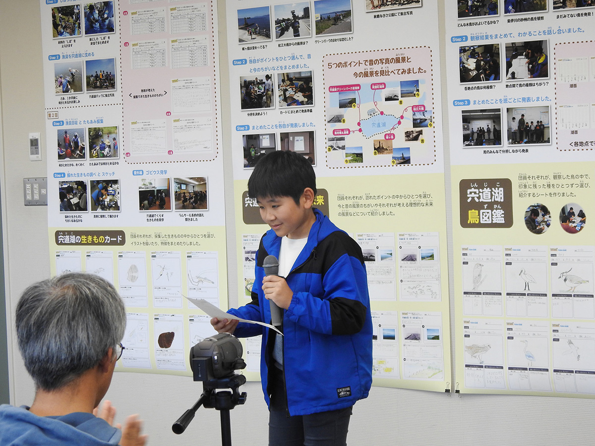 今年度の探偵団の締めくくりとして活動報告会を行いました。午前中はこれまでの活動を振り返ったり、ラムサール条約について学んだことをおさらいしたりした上で、発表のための準備や練習をしました。 午後の活動報告会では、団員一人ひとりに活動を通して印象に残ったこと、発見したことなどを説明してもらったほか、今年度の依頼だった「宍道湖に関するコトやモノの中でこれだけは未来に残したいと思うもの」について発表してもらいました。団員たちからは「たくさんの生きものや自然」、「美しい宍道湖やその景観を守るために活動する人々」、「宍道湖を通して結ばれる絆」といったさまざまな回答が聞けたほか、それらを残していくために「ゴミ拾いをして景観を守る」、「宍道湖の水質検査をする」、「湿地に関わる人たちと交流する」など、自分たちにできることについての発言もありました。 修了後も探偵団での経験を糧に、団員の皆さんが宍道湖の豊かな自然を未来へつなぐ架け橋となってくれることを心より願っています。