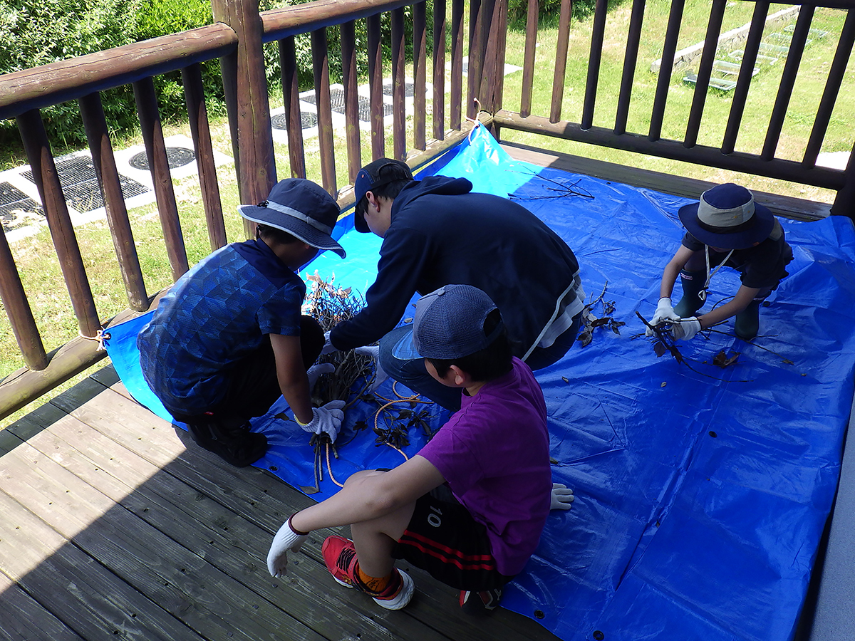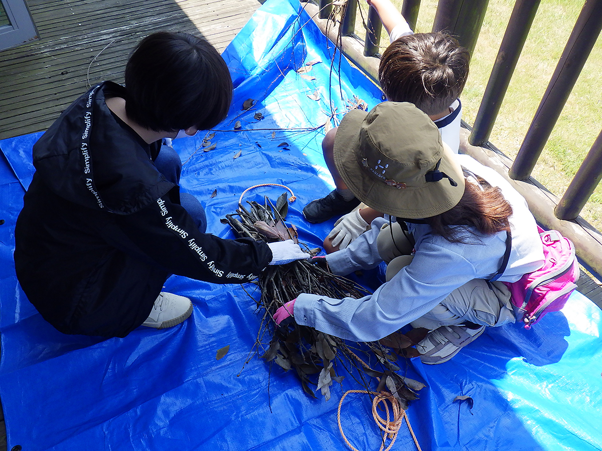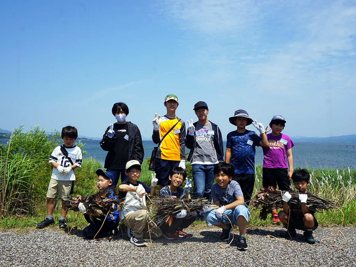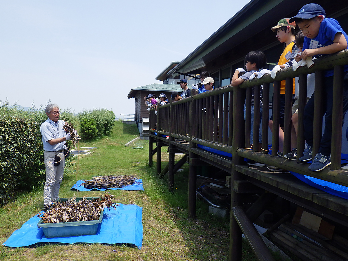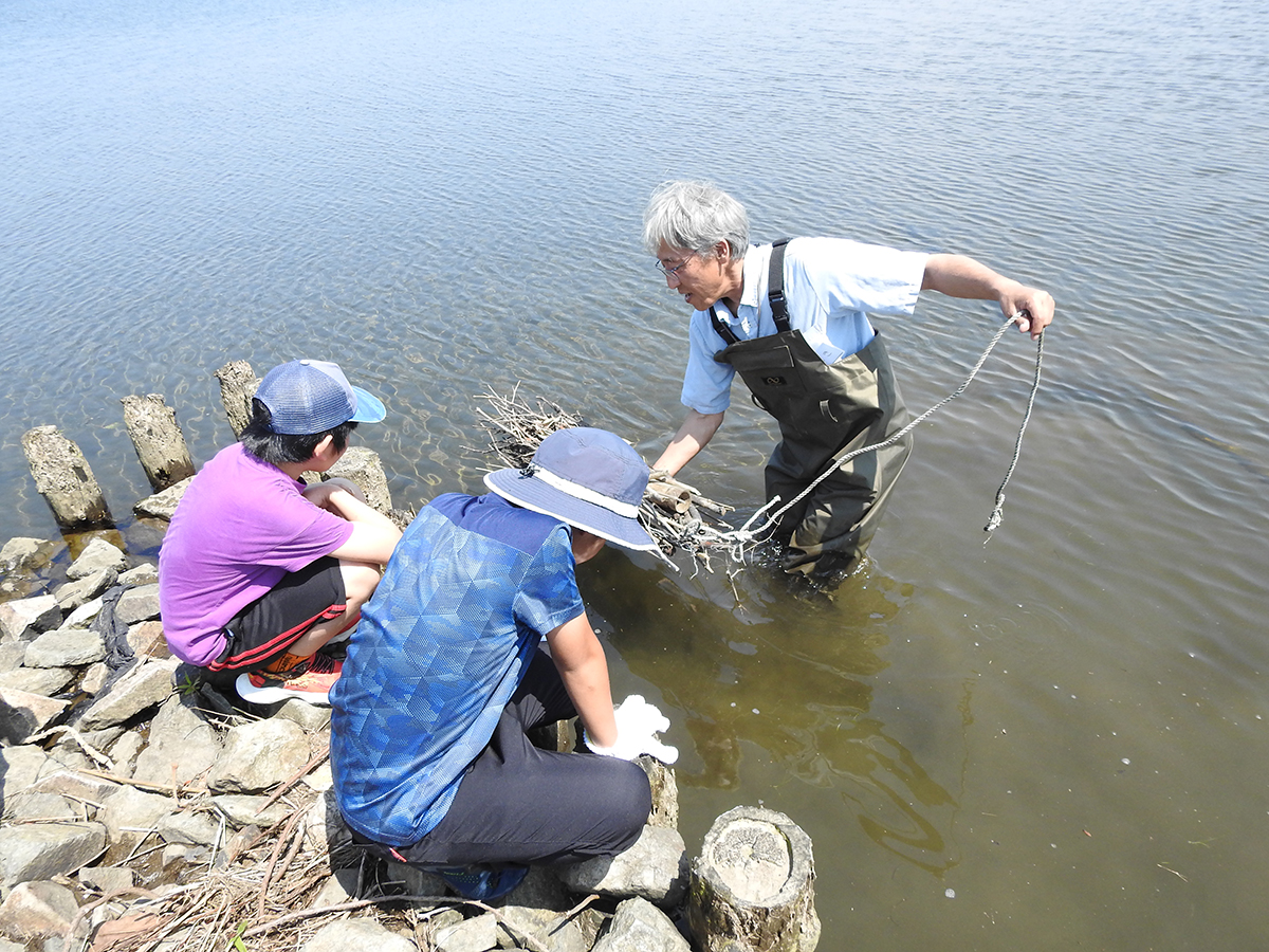 令和7年度のラムサール探偵団が始まりました。今年度は、13名で活動します。結団式では、団員へのお題が書かれた依頼状を渡しました。今年度のお題は、「宍道湖に関わるモノやコトの中で、これだけは未来に残したいと思うもの」です。計5回の活動を通じて、宍道湖について調べたり、考えたりして、お題に対する団員たちそれぞれの答えを見つけてほしいと思います。 結団式の後は、探偵団のテーマである「ラムサール条約」と、第1回のテーマである「しばづけ漁」について話をしました。話の後は、宍道湖の昔ながらの漁法「しばづけ漁」の漁具を実際に作製し、宍道湖へしずめました。しずめた漁具は、約1か月後の次回に引き上げます。どんな生きものが採れるのか、団員たちの予想は合っているのか、楽しみに次回を待ちたいと思います。