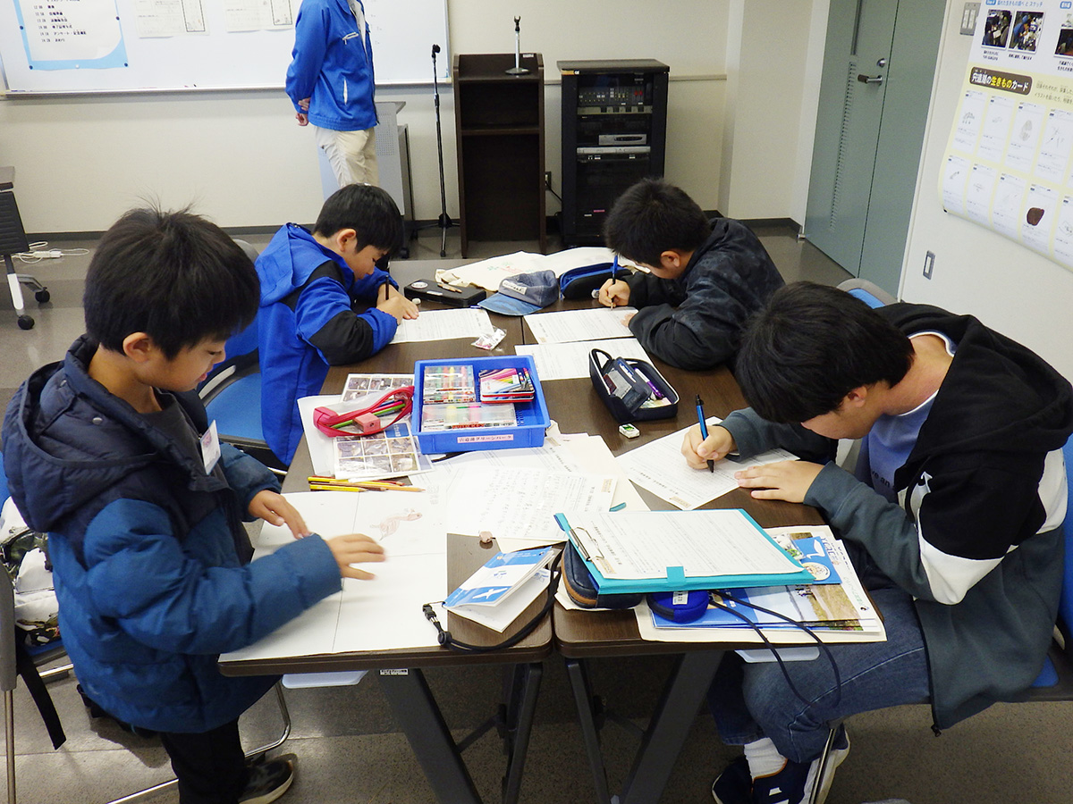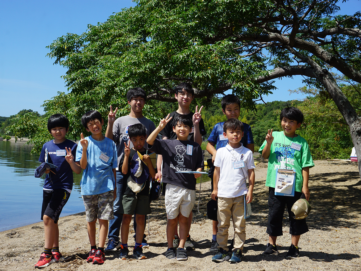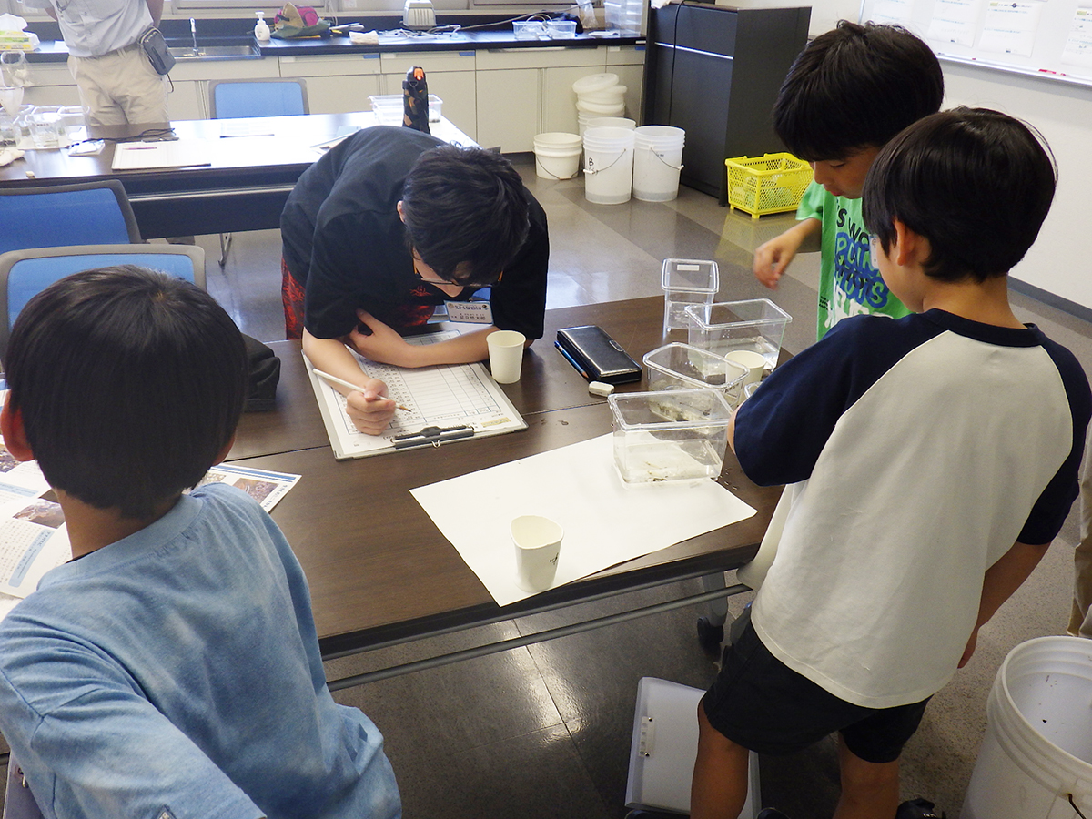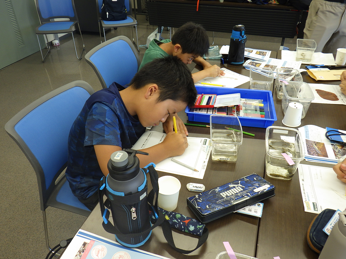 はじめに、前回の活動で宍道湖にしずめた「しばづけ」や、「たもあみ」で採れそうな生きものについて、ゴビウスの展示見学を通して予習しました。その後、宍道湖へ移動し、前回しずめた「しばづけ」を班ごとに引き上げ、生きものを採集しました。次に、「たもあみ」でも採集をおこないました。気温が高かったため、短い採集時間ではありましたが、どちらの方法でも、いろいろな生きものを採集することができました。午後は、採集方法ごとに採れた生きものを調べ、まとめました。似た生きものの違いを観察したり、採集方法によって生きものに違いが出たか班で話し合ったりした上で、結果を発表しました。最後に、各団員が気に入った生きものを選んでスケッチし、その生きものについて感じたことなどを書き留めました。移動が多く、屋外活動の回でしたが、団員みんなの協力のもと、無事に終えることができました。