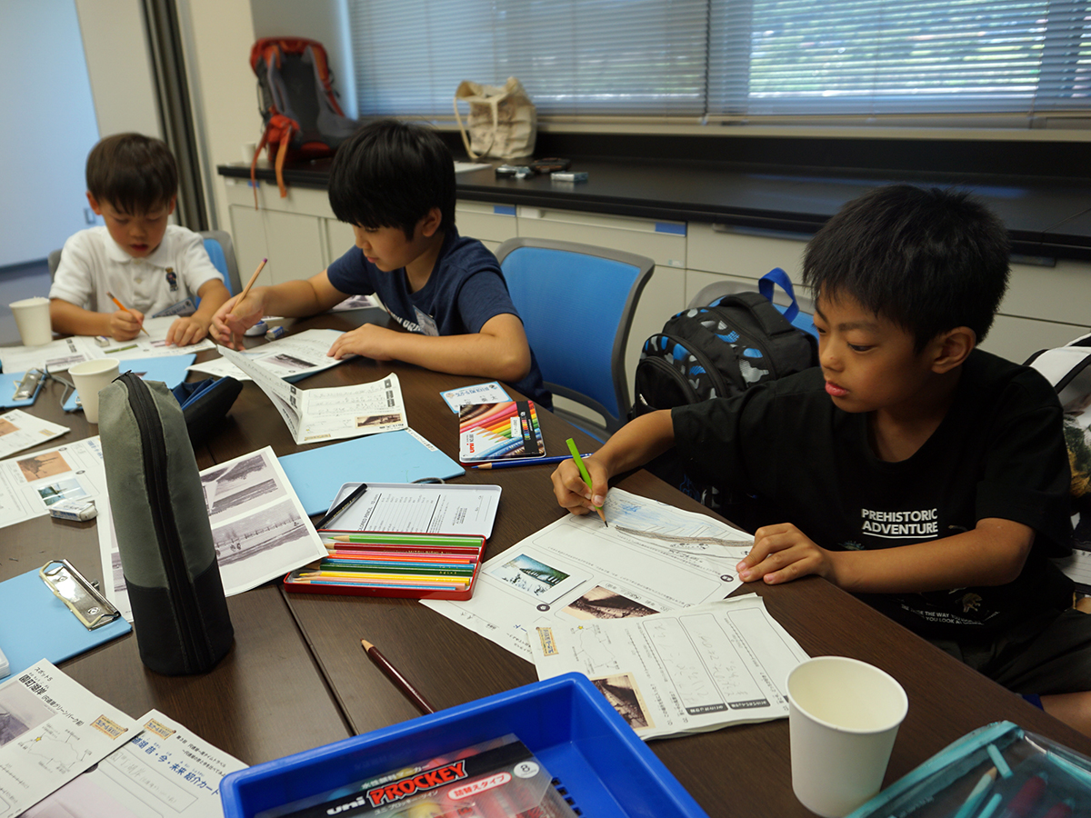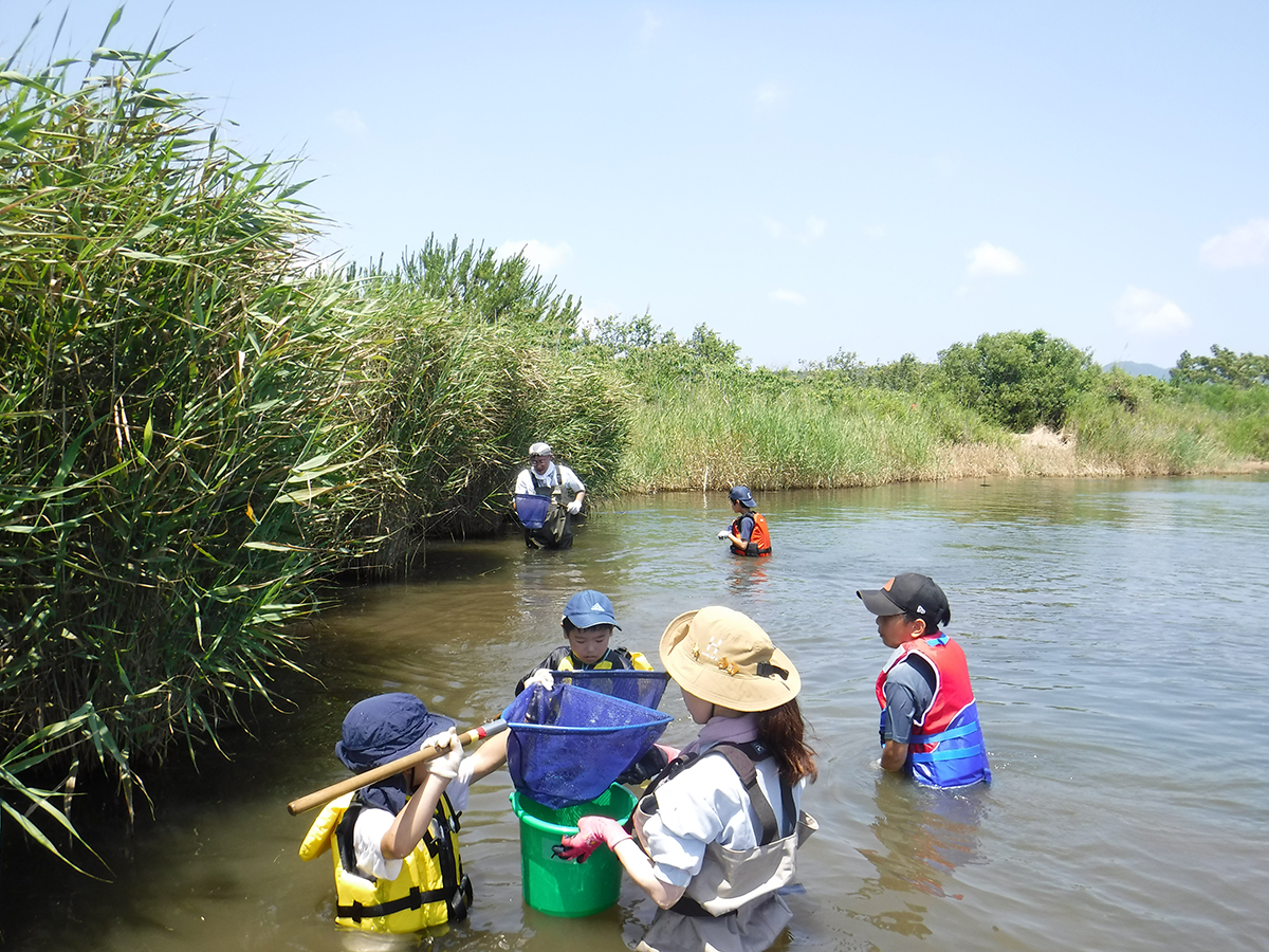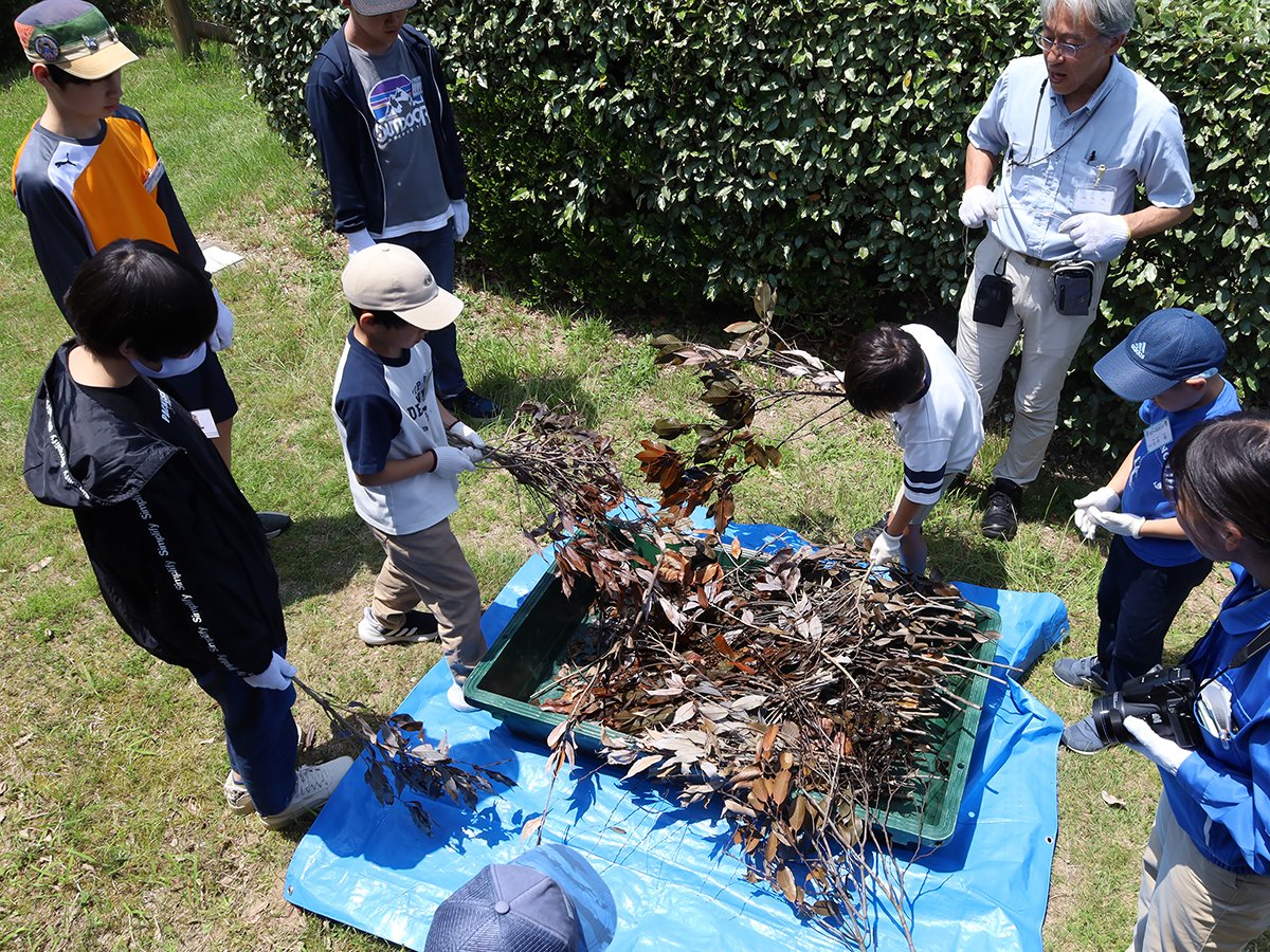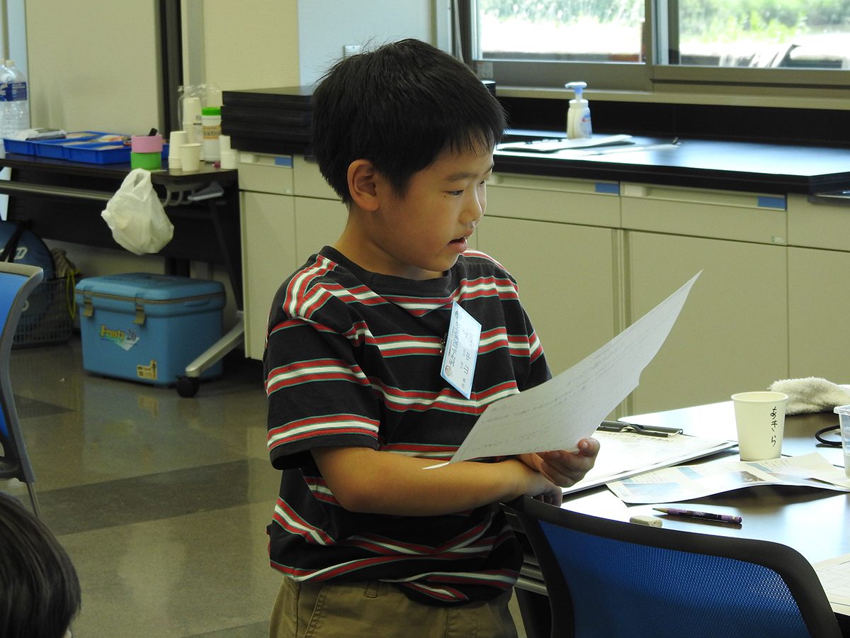 はじめに、前回の活動で宍道湖にしずめた「しばづけ」や、「たもあみ」で採れそうな生きものについて、ゴビウスの展示見学を通して予習しました。その後、宍道湖へ移動し、前回しずめた「しばづけ」を班ごとに引き上げ、生きものを採集しました。次に、「たもあみ」でも採集をおこないました。気温が高かったため、短い採集時間ではありましたが、どちらの方法でも、いろいろな生きものを採集することができました。午後は、採集方法ごとに採れた生きものを調べ、まとめました。似た生きものの違いを観察したり、採集方法によって生きものに違いが出たか班で話し合ったりした上で、結果を発表しました。最後に、各団員が気に入った生きものを選んでスケッチし、その生きものについて感じたことなどを書き留めました。移動が多く、屋外活動の回でしたが、団員みんなの協力のもと、無事に終えることができました。