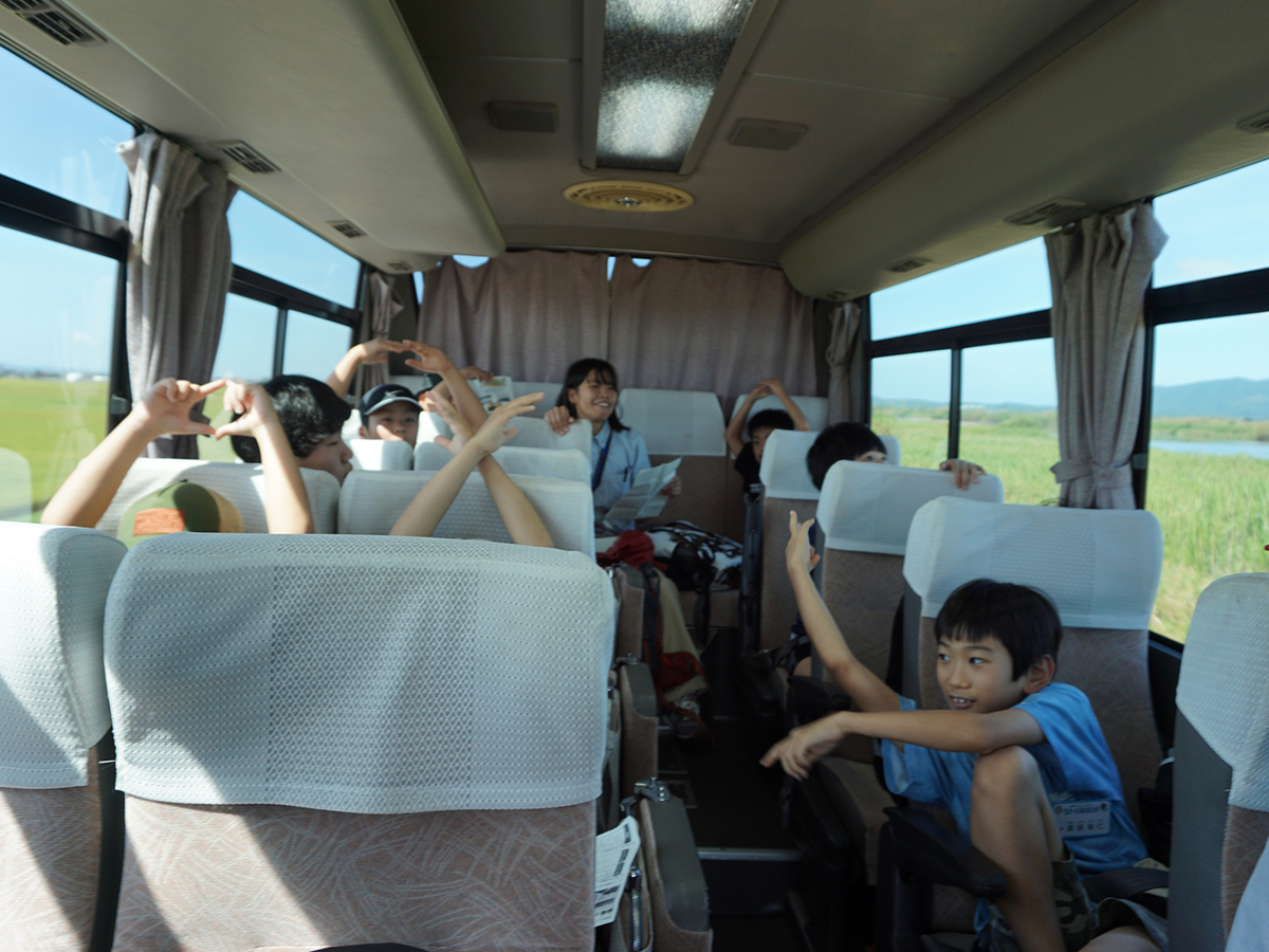 第3回目は、バスで宍道湖を一周しながら、いくつかのポイントで60〜100年ほど昔に撮られた湖岸の風景写真と、今の様子を見くらべて、湖岸がどのように変化したかを調べました。移動中のバスの中では、宍道湖の自然や歴史についての○×クイズで盛り上がりました。午後は、各団員が気に入ったポイントをひとつ選び、昔と今の宍道湖岸を見くらべて気づいたことや、体験を通して考えた未来の宍道湖岸の理想像などについてワークシートにまとめました。最後に、まとめたことを各自に発表してもらいました。