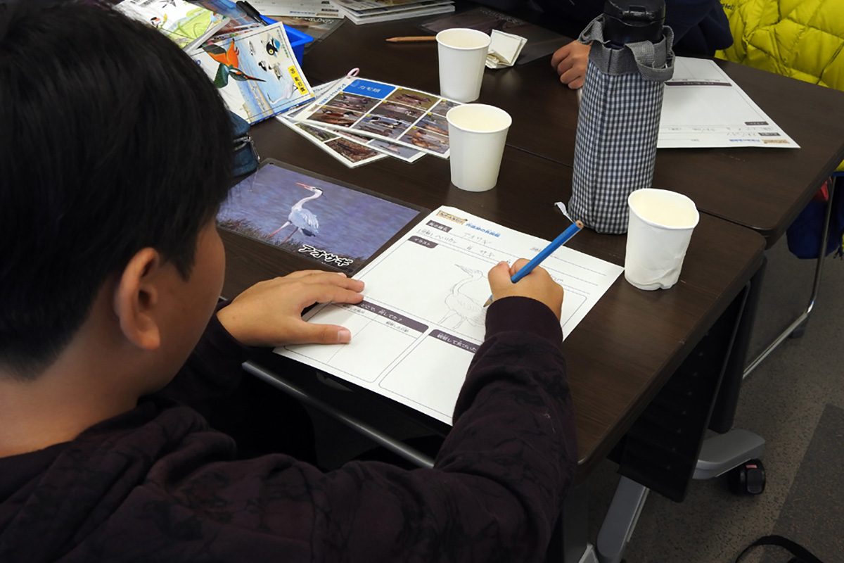 第4回は、宍道湖の西岸にある斐伊川河口の周辺でバードウォッチングを行いました。特に湖面、田畑、砂州、ワンドやヨシ原といった環境に注目し、異なる環境を持つ4つの地点で、双眼鏡や望遠鏡を使って観察できた鳥の種類、数、行動を記録しました。 天候に恵まれた上、マガンやヒシクイ、コウノトリといった、希少な大型水鳥も観察することができました。 午後は記録した鳥を地点別にグラフにまとめ、野鳥と生息環境の関係について考え、班ごとに発表しました。 最後に今回観察できた野鳥の中から1人1種類選び、その野鳥について紹介するカードを作ってもらいました。