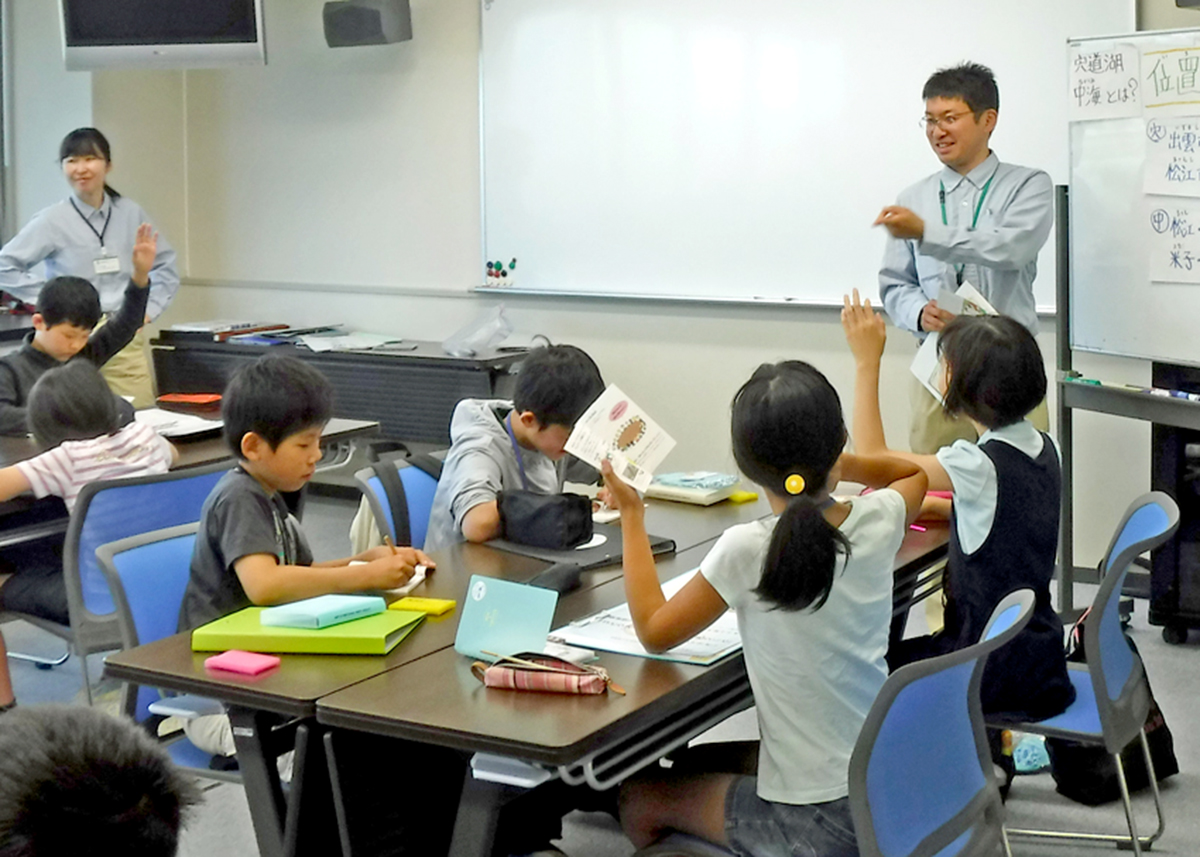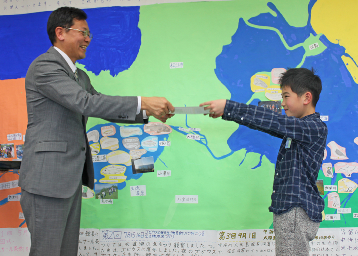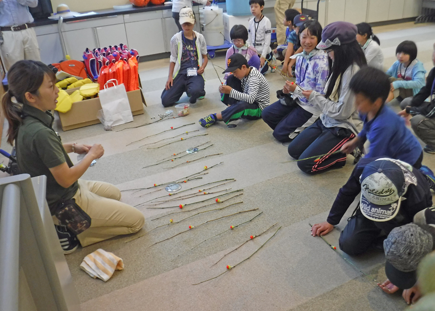 宍道湖グリーンパーク&ゴビウス ラムサール探偵団の趣旨を伝えるための結団式を行いました。団員同士が打ち解けるための名刺交換、ラムサール条約の勉強、また宍道湖自然館ゴビウスでは、ワークシートを使いながら見学しました。その後、宍道湖に入って生きもの採集を行い、観察、スケッチなどを行いました。 *写真をクリックすると大きく表示されます。