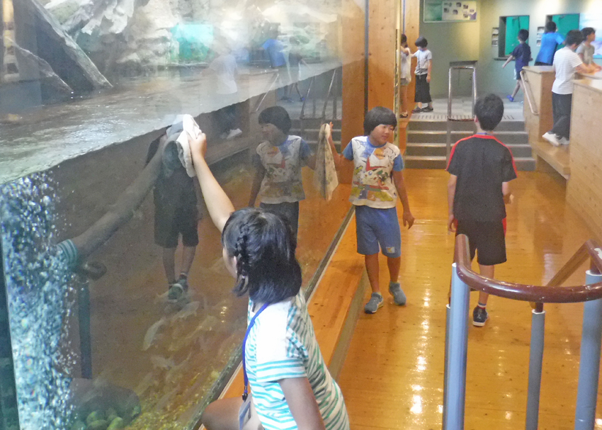 1日目は宍道湖に生息する生きものを調べるため平田船川河口で釣りを行い、釣った魚をゴビウスへ搬入することで汽水環境に生息する生きものを展示する際の工夫を学びました。また、ゴビウス館内に寝袋を持って入り、水槽の前で仲間と一緒に楽しみながら寝ました。2日目はゴビウスの開館準備作業を体験し、活動報告会に向けて生きもの地図作りをスタートしました。*写真をクリックすると大きく表示されます。