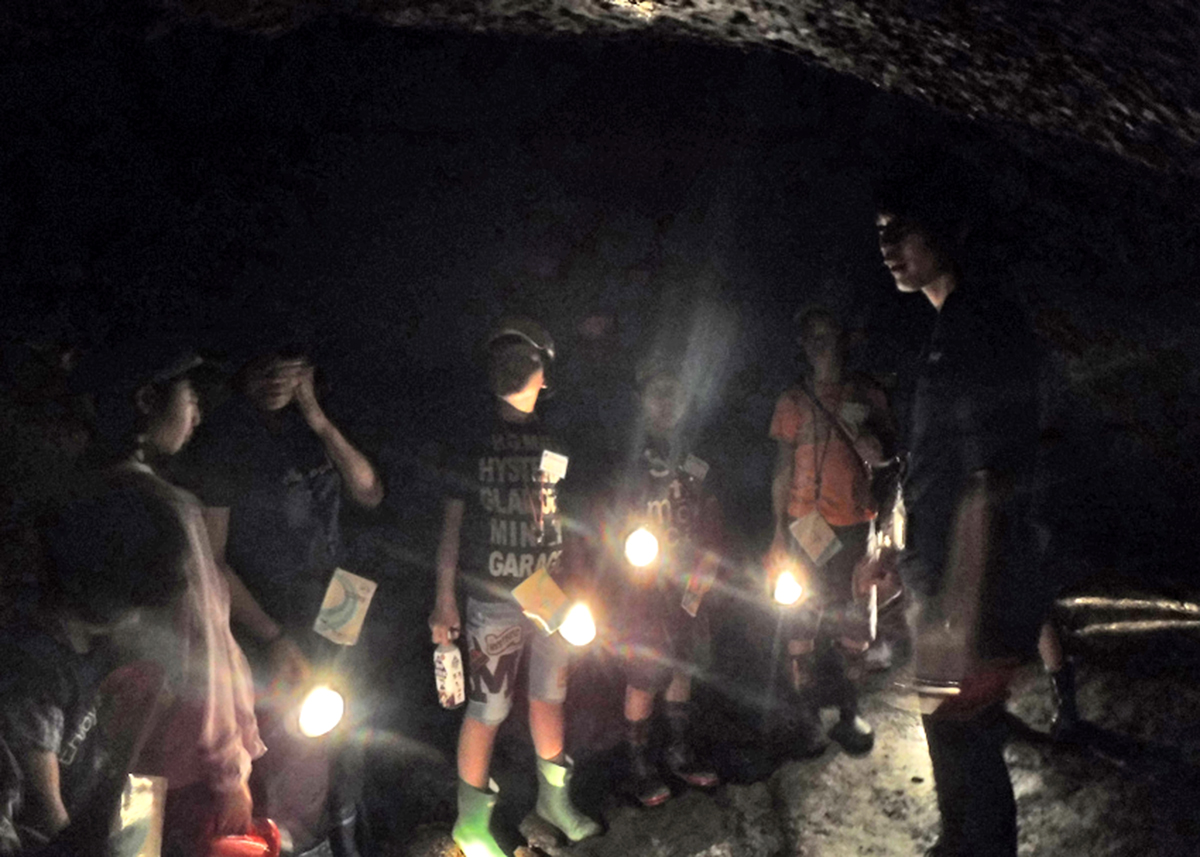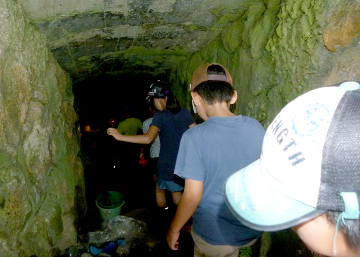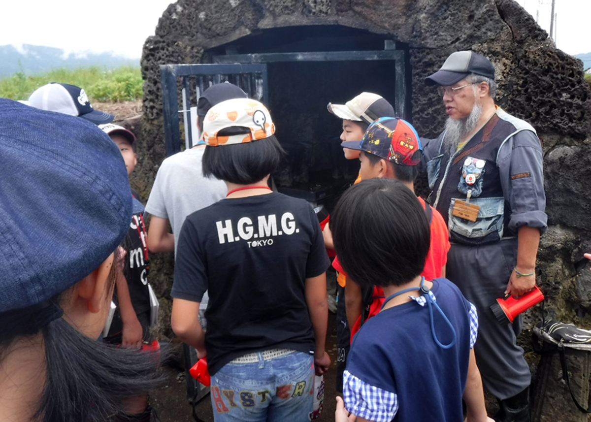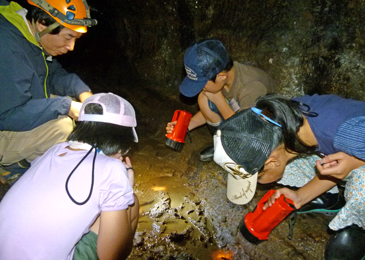 今回はしまね自然観察指導員で火山洞窟学会に所属している門脇和也先生、島根大学の辻本彰先生、新部一太郎先生、計3名の講師をお招きし、大根島の溶岩洞窟「竜渓洞(りゅうけいどう)」に行き、洞窟探検や生きもの探しを行いました。