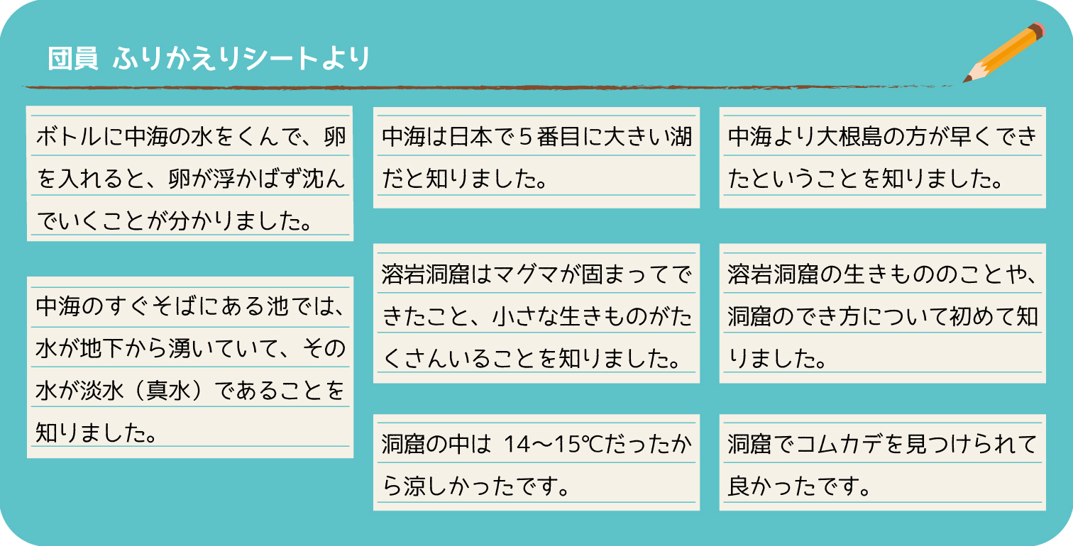 真っ暗な竜渓洞では、懐中電灯で足下を照らしながら生きものを探し、わずか数ミリしかない生きものコムカデやトフシアリ、ヨコエビのなかまなどを見つけることができました。また、溶岩が流れた跡やパホイホイ溶岩を観察し、洞窟の成り立ちについても学びました。昼食で立ち寄った波入親水公園では淡水レンズというものを教わり、大根島に真水がたくさんある秘密を知ることができました。