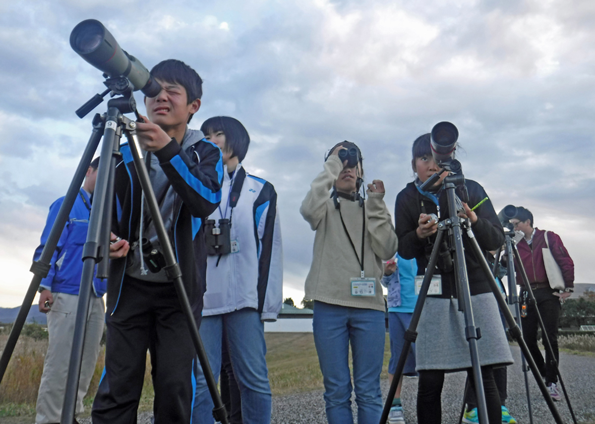 双眼鏡や望遠鏡、三脚の使い方をしっかり練習して、斐伊川河口と鳥ヶ崎に向かい、バードウォッチングを行いました。 斐伊川河口ではマガンの群れがたくさん休んでおり、みんなでカウントをして400羽のマガンを記録しました。 鳥ヶ崎ではスズガモとキンクロハジロがまざった群れを観察しました。群れとの距離はかなり離れていましたが、 その状態で2種のカモの特徴を見分けてみました。13時30分から16時までの観察時間で23種の鳥を観察することができました。