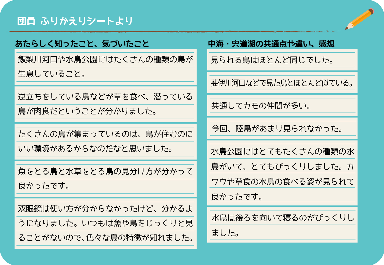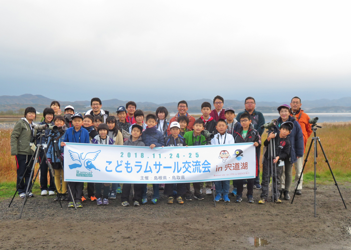 今年は私たちが活動している宍道湖で、こども湿地交流会が行われました。 中海、豊岡、荒尾干潟、宍道湖で活動する子ども達が集まり、宍道湖に生息する 水生生物や野鳥について一緒に学び、調べることで、またひとつ、湿地を守る輪が 広がったのではないかと思います。 これからも、私たちで渡り鳥の大切な生息場所"湿地"を守っていきましょう。